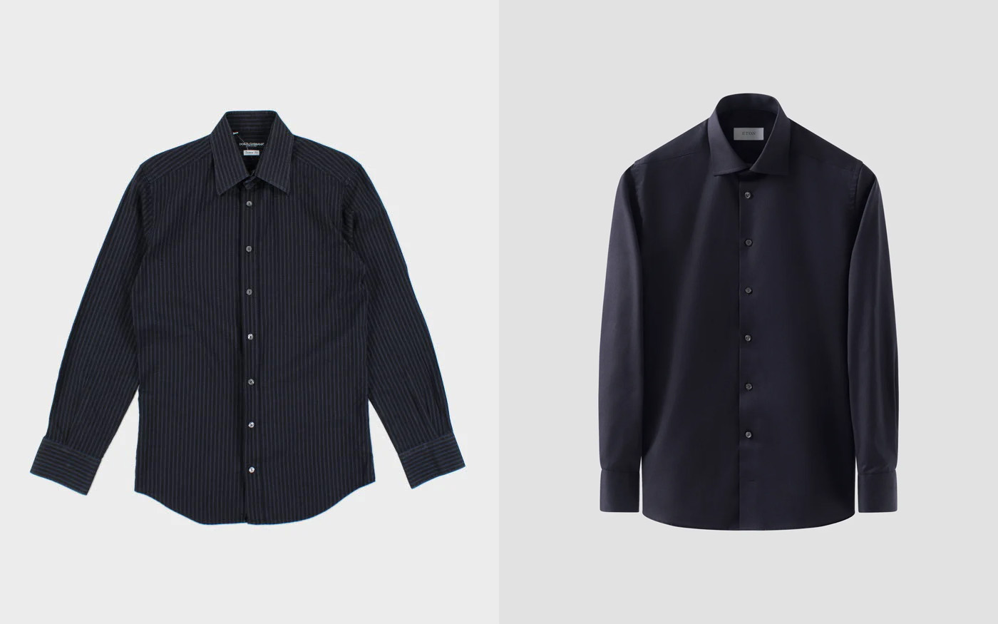 Which one do I cop?Left is slim and made of fine cotton poplin, right is fairly slim and made of very fine cotton twill.My usual outfit is a dressed down suit, I work in a young environment and I'm usually the best and most formally dressed person.I like the cut of left a bit more, it's slimmer, has a bigger and taller collar and smaller arms, though I like the fabric of right more, and I'm not all too sure about the busier details of left (stripes front placket) vs. the plainness of right (solid blue, french placket, more subtle collar).