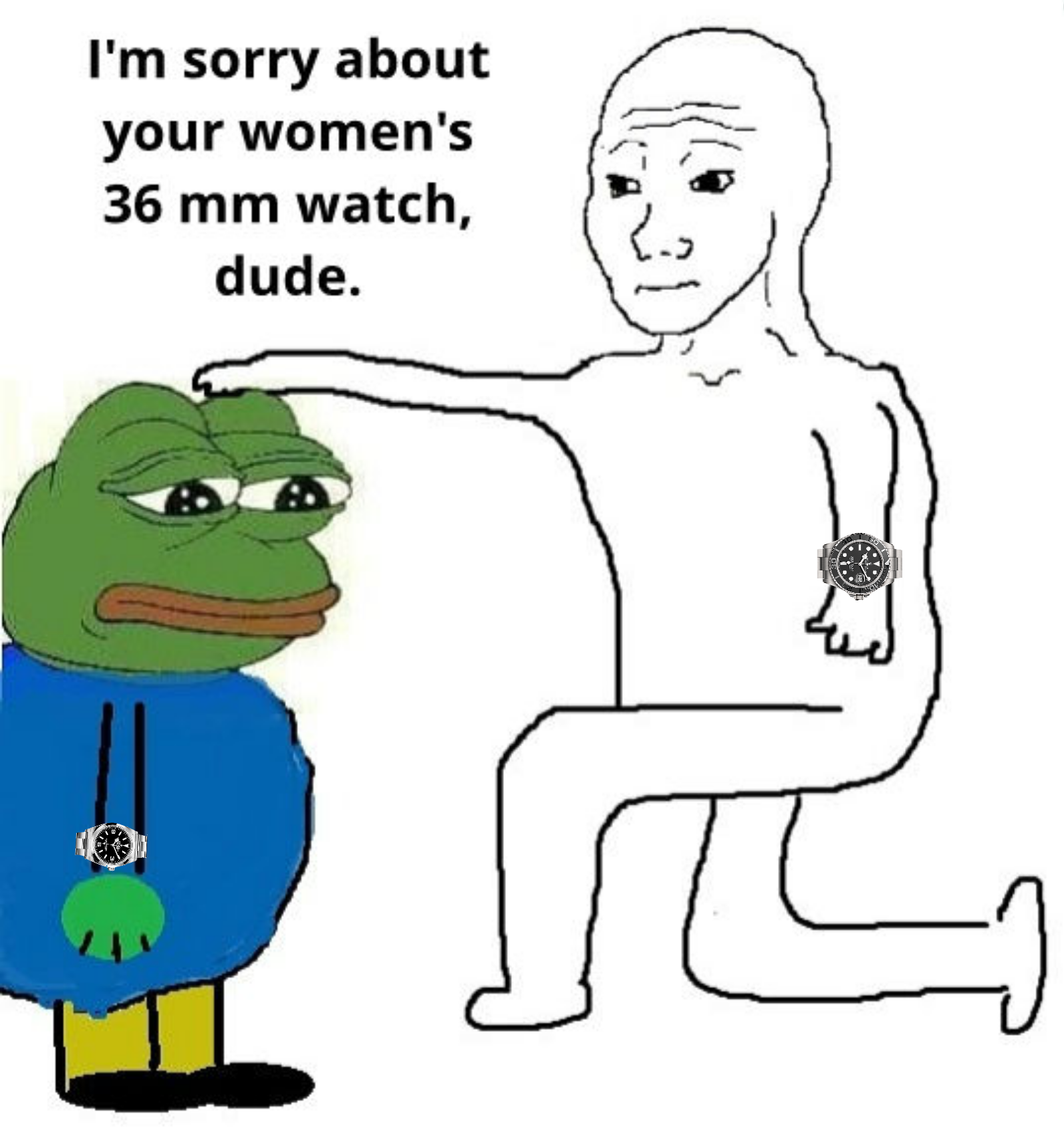 >>18690052Sadly most watch buyers are middle-aged men who grossly overestimate their wrist size and/or simply don't care and want the largest amount of metal for their money.I can assure you that 99% of the shitposters who call your 36mm watch a "girls watch" actually have 16cm wrists and would look ridiculous with a 41mm Datejust.It's a below average/average IQ male thing, amplified by social media "flex culture".>GRUG SPEND BIG MONEY SO GRUG WANT BIG WATCHThis also explains why retards always buy a diver or a chronograph as their first watch.>IT HAS MORE STUFF SO IT'S MORE BETTER DURRRRSeriously. Just go to the poorfag watch thread and the only watches they discuss are $50 chink chronograph with purple and orange dials and shit. Fascinating.