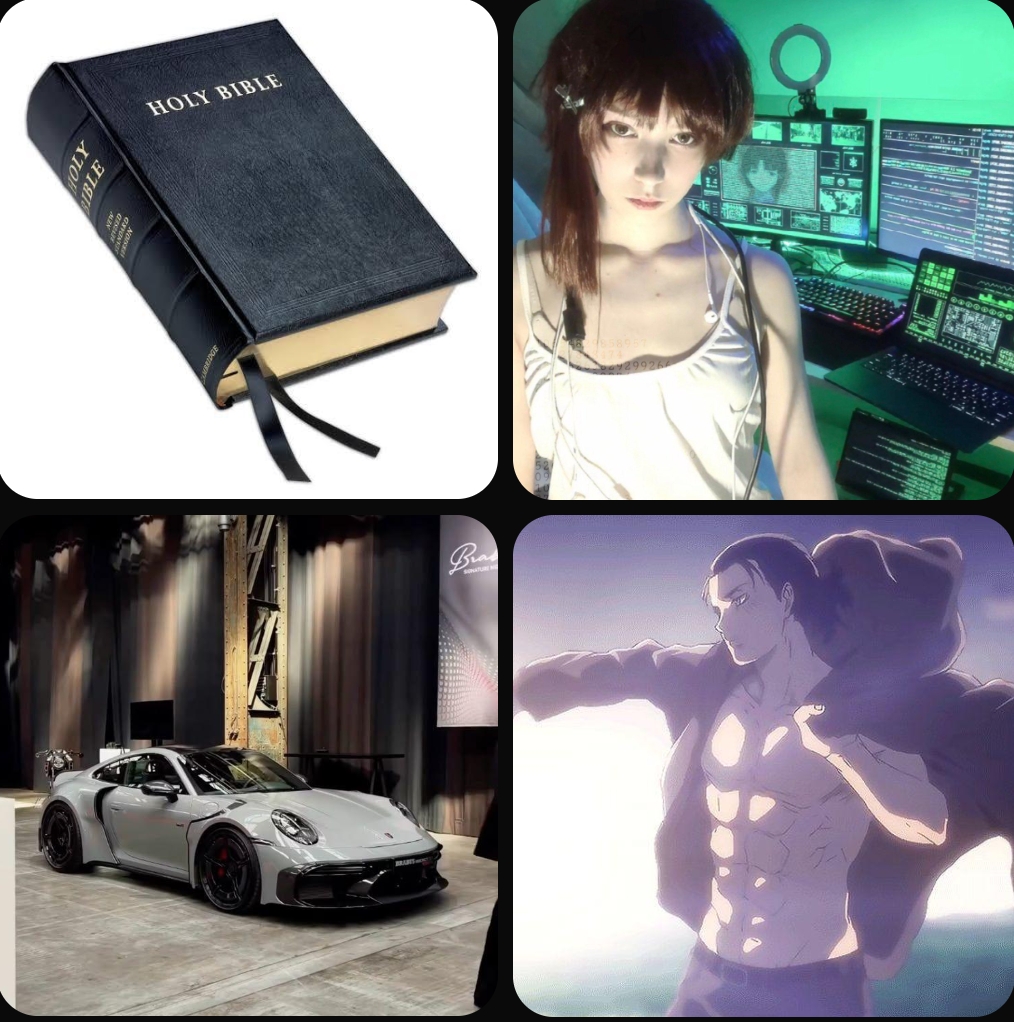 Sorry if I don't remember the 4 panel correctly1. Bookmaxxing2. Foidmaxxing3. Carmaxxing4. Physiquemaxxing