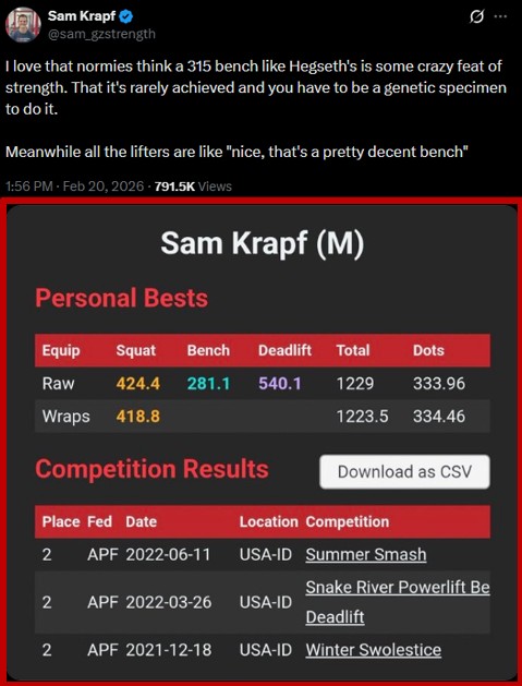 Fitness influencer talking about 315lbs being an "average" lift, turns out he is a self-professed "starting strength coach" who transformed himself into a literal T-rex. Sub 300lbs bench. This is a friendly reminder to newbie /fit/izens, SS is for beginners only and you should never run it for more than 90 days before transitioning to a better program.