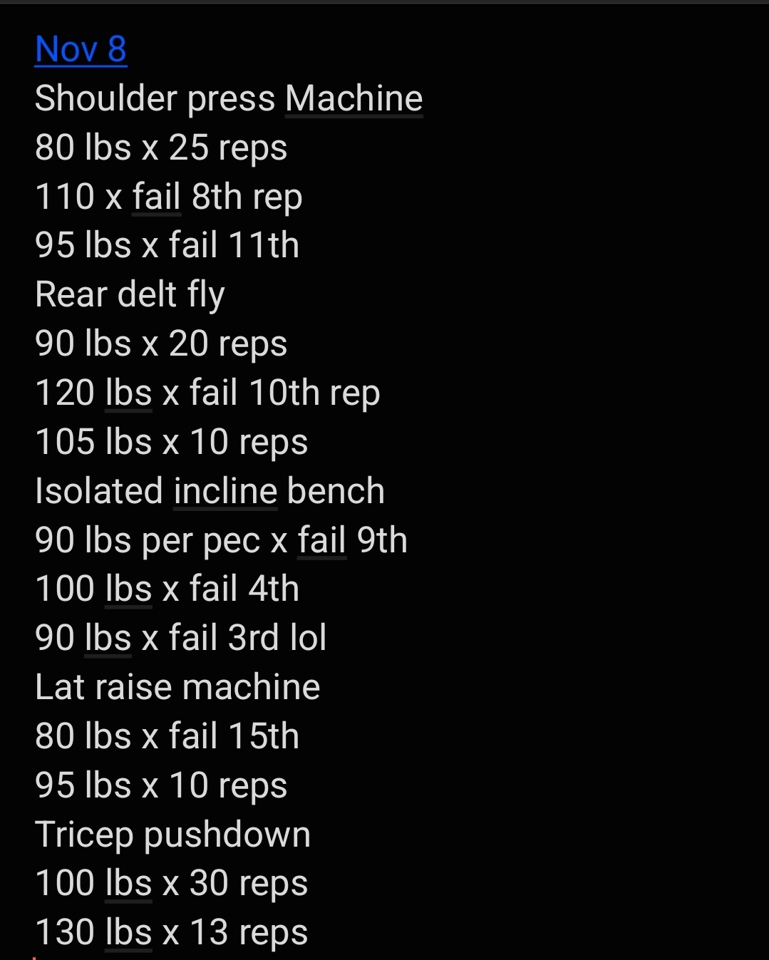 >>76809327Seated face pulls (2 handles) - 55lbs 3x10Bench press - 235lbs 3x5Seated Behind neck press - 120lbs 3x5Lat pull downs - 230lbs 3 sets 9,8,7 repsPec Deck - 230lbs 3 sets 10,10,8 repsT-bar row - 140lbs 3x10Tomorrow is squats and deadlifts so wish me luck.