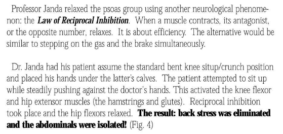 >>76712407for all his odd lingo it's plain English. He's telling you that ab exercises are not ab exercises, but hip exercises, and he describes a way to disengage the hip muscles so that your abs can even contribute anything. The usual exercise for this is janda situps, which require another person or some careful setup.pic is from Pavel's "Bulletproof Abs", which sells a defunct device with a ridiculous name, the AB PAVELIZER, but he also goes into this stuff and offers more than that. It's his griftiest book but still good.Pavel nowadays thinks that you shouldn't isolate the abs, but just engage your core while lifting heavy weights.