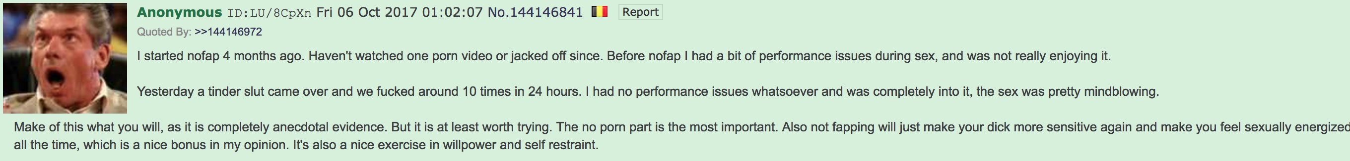 >>76721808nofap is an incel cult.Notice how nofappers never talk about fucking their gf's.All they do is countdown the days until they will magically have the power to look a girl in the eye and say hello in the hopes of have sex some day