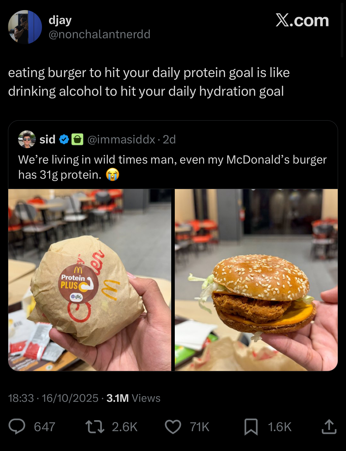 >>76737943No. A burger is fine. Though I would never go to McDonalds to get one. Anything you make at home will be better and cheaper these days. Home-made burgers are a especially good. This "burgers are bad 4 u" retardation is just seeing the guy who guzzled down 5000 calories of icecream and cake eating a burger and concluding "burger is bad." A burger is just a sandwich with ground beef. If it's not overcooked and you use good quality ground beef, vegetables, and cheese it is good for you. And then there's still the vegan/vegetarian myth (most jeets are vegetarian hence the skinny fat or just plain fat physiques) that meat is bad for you when the fact of the matter is that being a sloth and glutton are what are actually bad for you. With regular movement (not necessarily exercises) and moderation with a well balanced diet prevents these problems. >>76737993It's a marketing thing. It's actually more like 25g of protein according to the McD website.>https://mcdonaldsblog.in/2025/07/a-first-of-its-kind-at-mcdonalds-india-power-up-your-mcdonalds-burgers-our-new-protein-plus-slice-has-arrrrrived/The protein+ thing isn't even a real burger. No ground beef. It's some kind of söy protein slop mush that's been breaded and fried with a slice of a söy protein product, that thing in the bottom of the picture between the patty and bottom bun. Looks like there's a slice of milk protein product which is commonly mislabeled as "cheese." Literal slop for pigs. But the average vegetarian goes by the mantra these days, "I am a pig and I eat slop."A sandwich with 4 oz of beef or chicken and an oz of cheese already has 26g or more of protein.