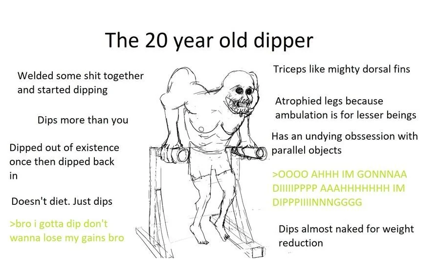 based, fuck anti dip wimps, you should also do heavy skull crushers as well in a 5-6 rep range, blows up the tris, although I find I have to alternate between either heavy skull crushers or heavy dips as there isn't enough left in the tank doing heavy on both in one session.