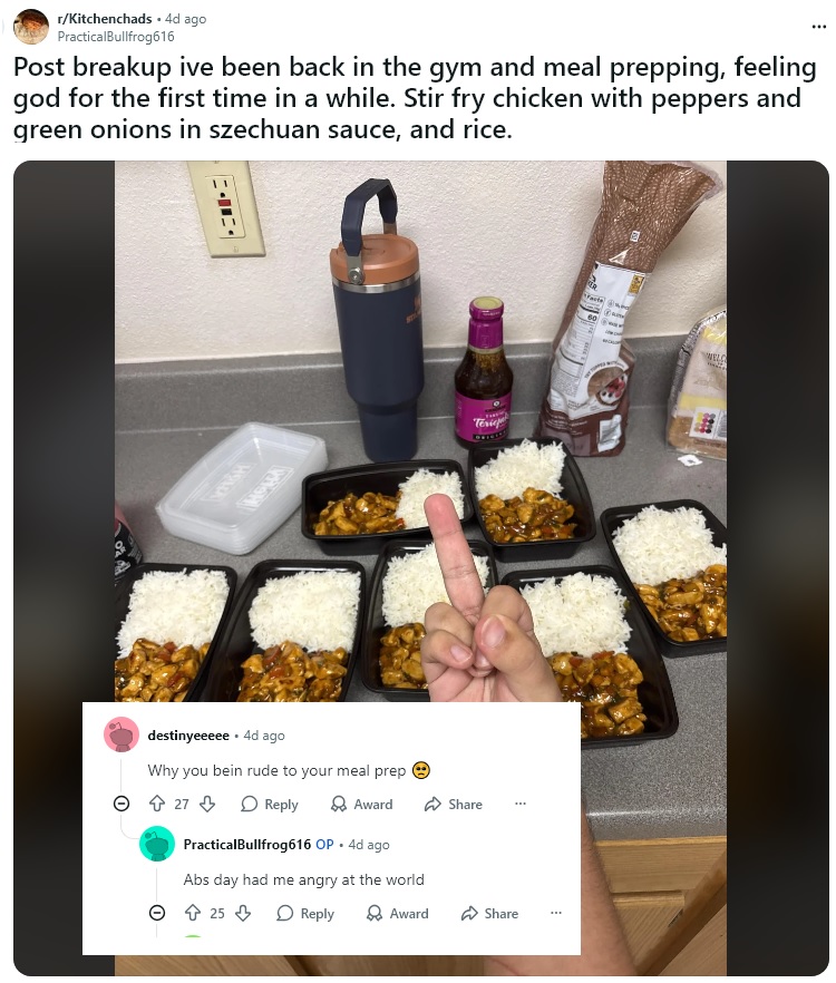 >meal prep>I’m gonna eat saucy teriyaki chicken with too much rice and no vegetables every dayskin and BMI checks out
