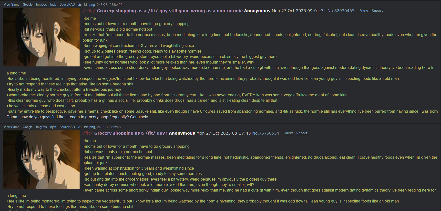 >be me>moms out of town for a month, have to go grocery shopping>bit nervous, thats a big normie hotspot>realize that i'm superior to the normie masses, been meditating for a long time, not hedonistic, abandoned friends, enlightened, no drugs/alcohol, eat clean, I crave healthy foods even when Im given the option for junk>been waging at construction for 3 years and weightlifting since>got up to 2 plates bench, feeling good, ready to slay some normies>go out and get into the grocery store, eyes feel a bit watery, weird because im obviously the biggest guy there>see hunky dorey normies who look a lot more relaxed than me, even though they're smaller, wtf?>even came across some short dorky indian guy, looked way more relax than me, and he had a cute gf with him, even though that goes against modern dating dynamics theory ive been reading here for a long time>feels like im being monitored, im trying to inspect the veggies/fruits but I know for a fact Im being watched by the normie hivemind, they probably thought it was odd how tall lean young guy is inspecting foods like an old man>try to not respond to these feelings that arise, like on some buddha shit>finally made my way to the checkout after a treacherous journey>what broke me: clearly normie guy in front of me, taking out all these items one by one from his granny cart, like it was never ending, EVERY item was some veggie/fruit/some meat of some kind>this clear normie guy, who doesnt lift, probably has a gf, has a social life, probably drinks does drugs, has a career, and is still eating clean despite all that>he was clearly at ease and casual too>puts my entire life to perspective, gave me a mental check like on some Sasuke shit, like even though I have 6 figures saved from abandoning normies, and /fit/ as fuck, the normie still has everything I've been barred from having since I was bornDamn.. how do you guys find the strength to grocery shop frequently? Genuinely.