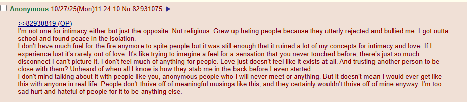 >>76768594>unattractive loserI've had a gf before and been approached in public before so it's not that. Normiedom just disgusts me on a spiritual level and goes against my moral code.