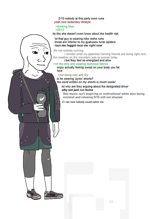 >>76770446I dunno, I just wanted to bounce some ideas. I'm excited to start running, or maybe I'm excited to buy stuff lmao. It'll be a few weeks before I go out. A guy I work with runs a ton so I plan to ask him for some less common tips. I still got the good memories of cycling, riding fast, hitting hard sprints, seeing various car wrecks. There's also the bad memories, like people intentionally trying to hit me, screaming at me, almost crashing. Maybe it's time to build new memories of running.