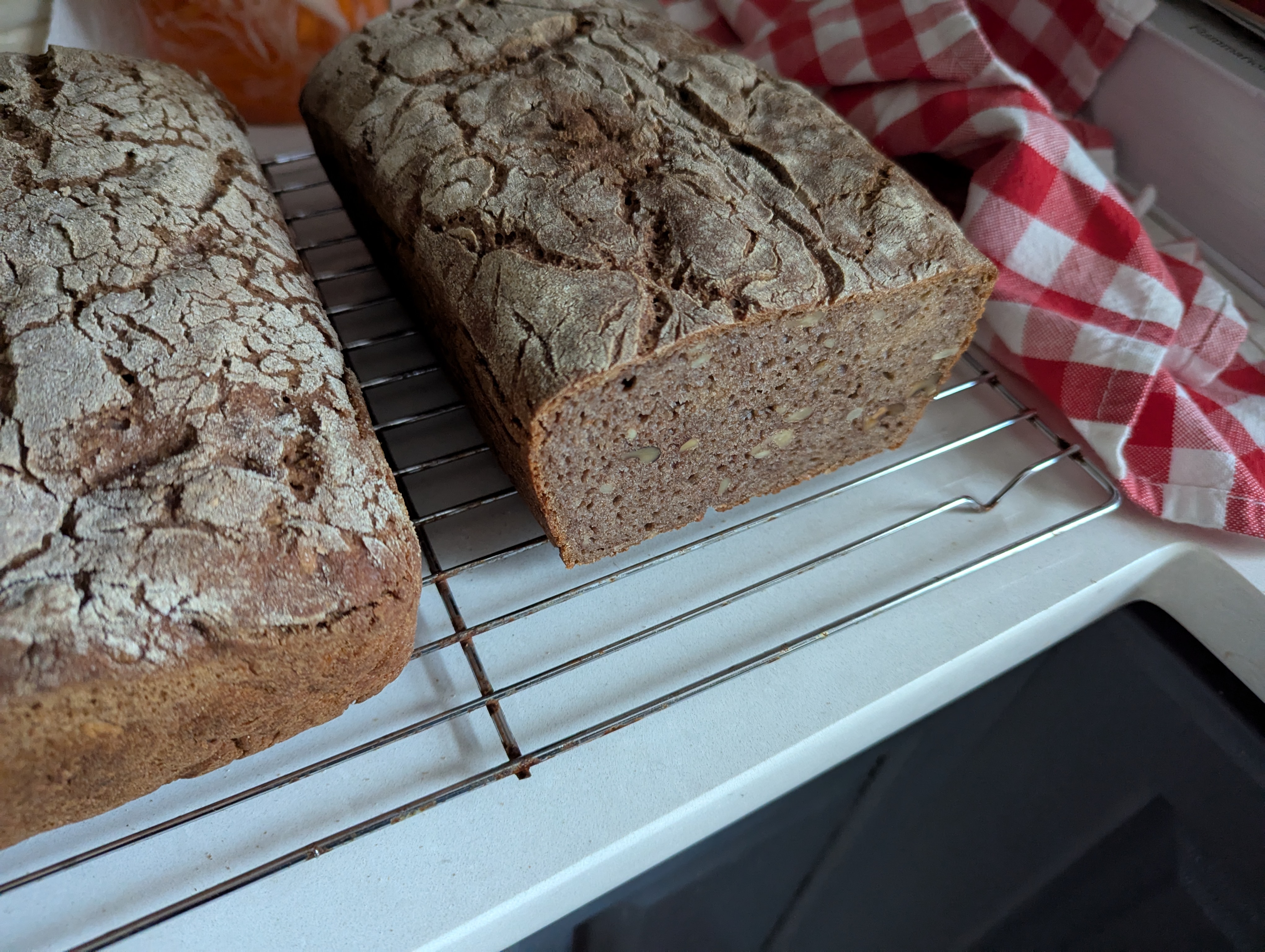 I just finished baking two loaves of pumpernickel with walnuts and sunflower seeds. Tastes great with some jam.