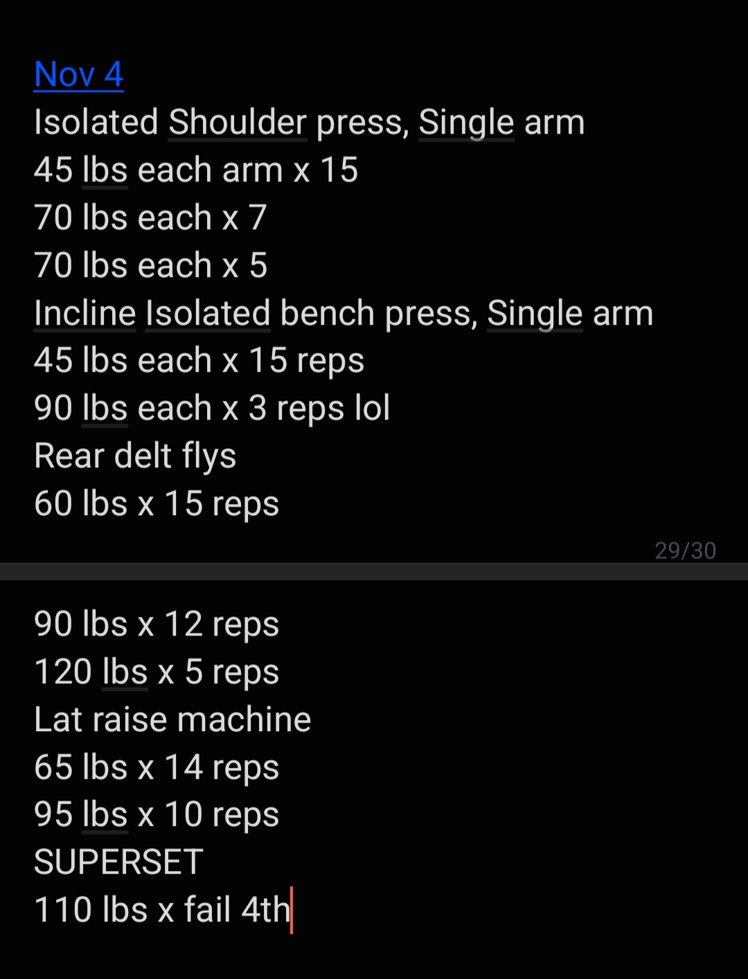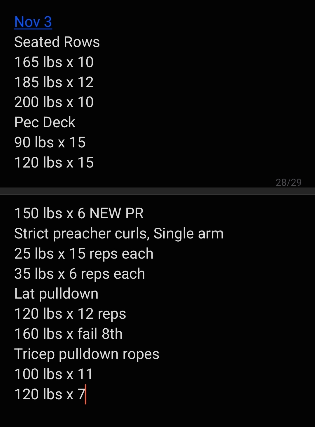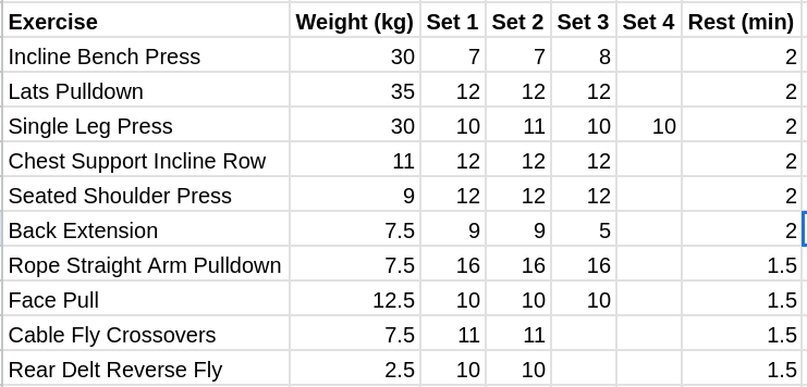 >Preacher Curl Machine75x595x5>Hammer Curls25x545x6>Ab Crunch Machine130x5190x7>Wrist Curls35x552.5x7>Machine Overhead Press70x5120x7>Rear Delt Fly120x5168x4>SLDL190x5250x6
