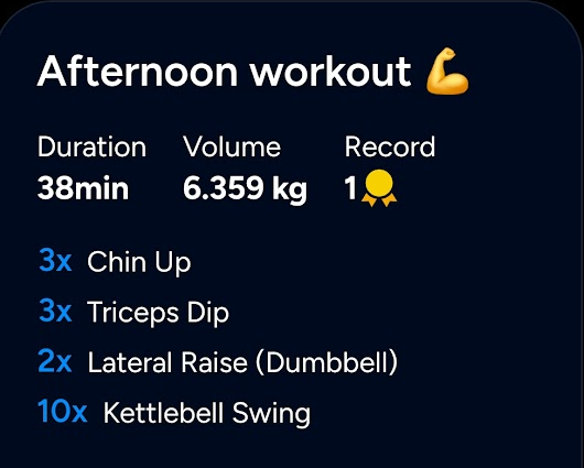 Today I remembered way too late in the day that I actually had work in the afternoon, so I just did a half-assed full body thingChinups, 3 x failure (6-5-4 reps)Dips, 3 x failure (around 13 reps)Lateral Raises 2 x failure (8kg dbs, around 15 to 18 reps)and then finished off with a 10 minutes, EMOM kb swing. 14 kg x 15 reps
