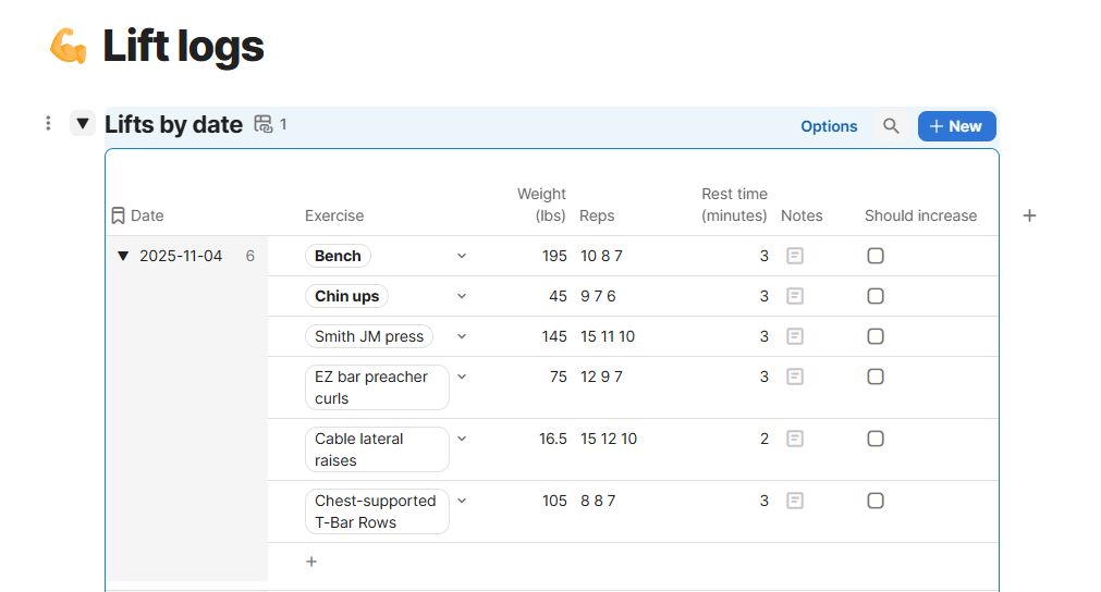Flat bench: 3x3 @ 260lb then 210lbx11Pull ups: 4x8-10OHP: Went for 3x5 @140lbs, didn't hit target reps on last 2 setsChest supported DB rows: 3x12-15Seated Bicep Curl: 3x12Lateral DB raises: 4x10-12Cardio: Brisk walk for 1 mile