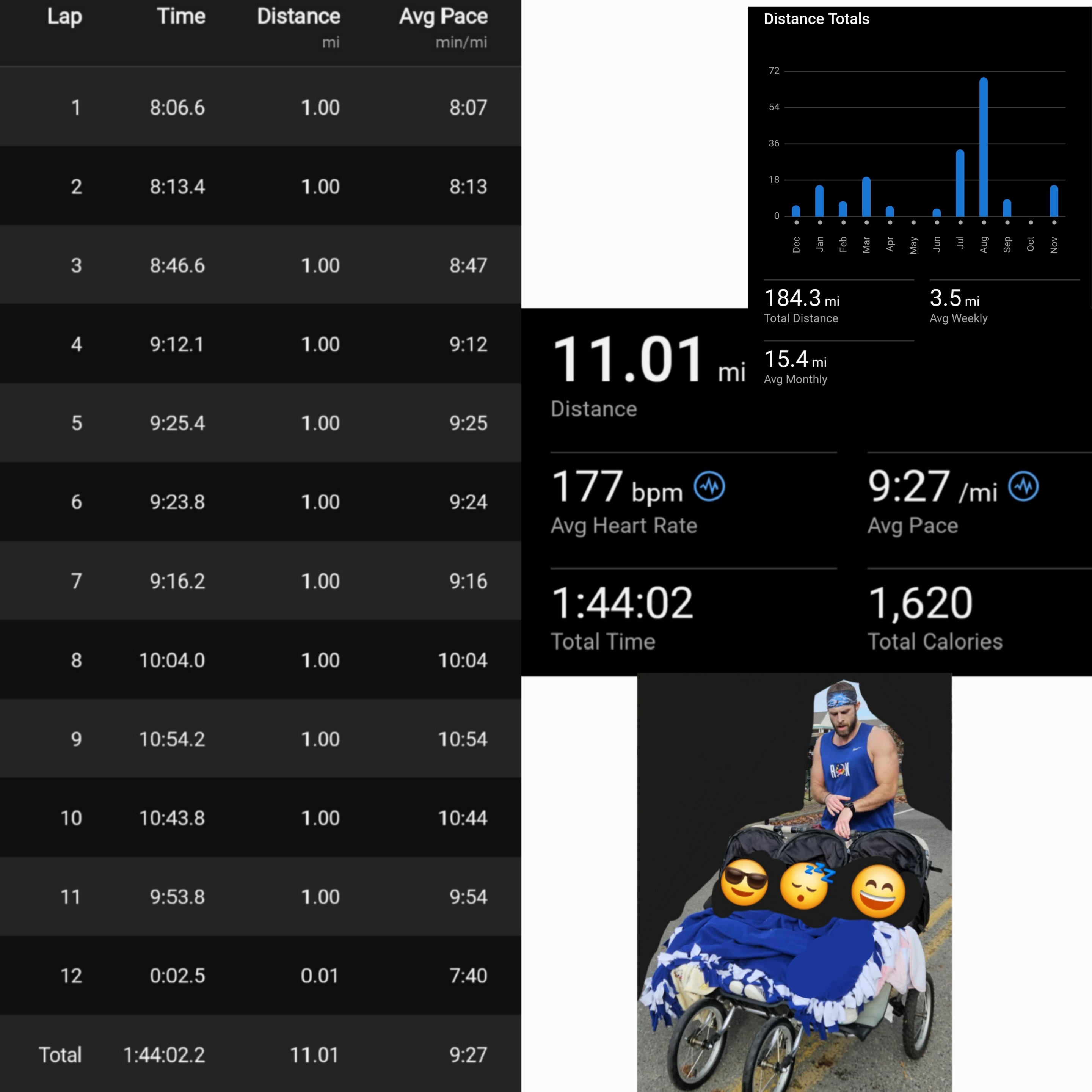 Veteran's day 11 miler. Hit a wall right 8 miles and started feeling sorry for myself. 9 min/mi was the goal, secondary was 9:30. At least I had that. If the race was further, I was on track to PR my 1/2.