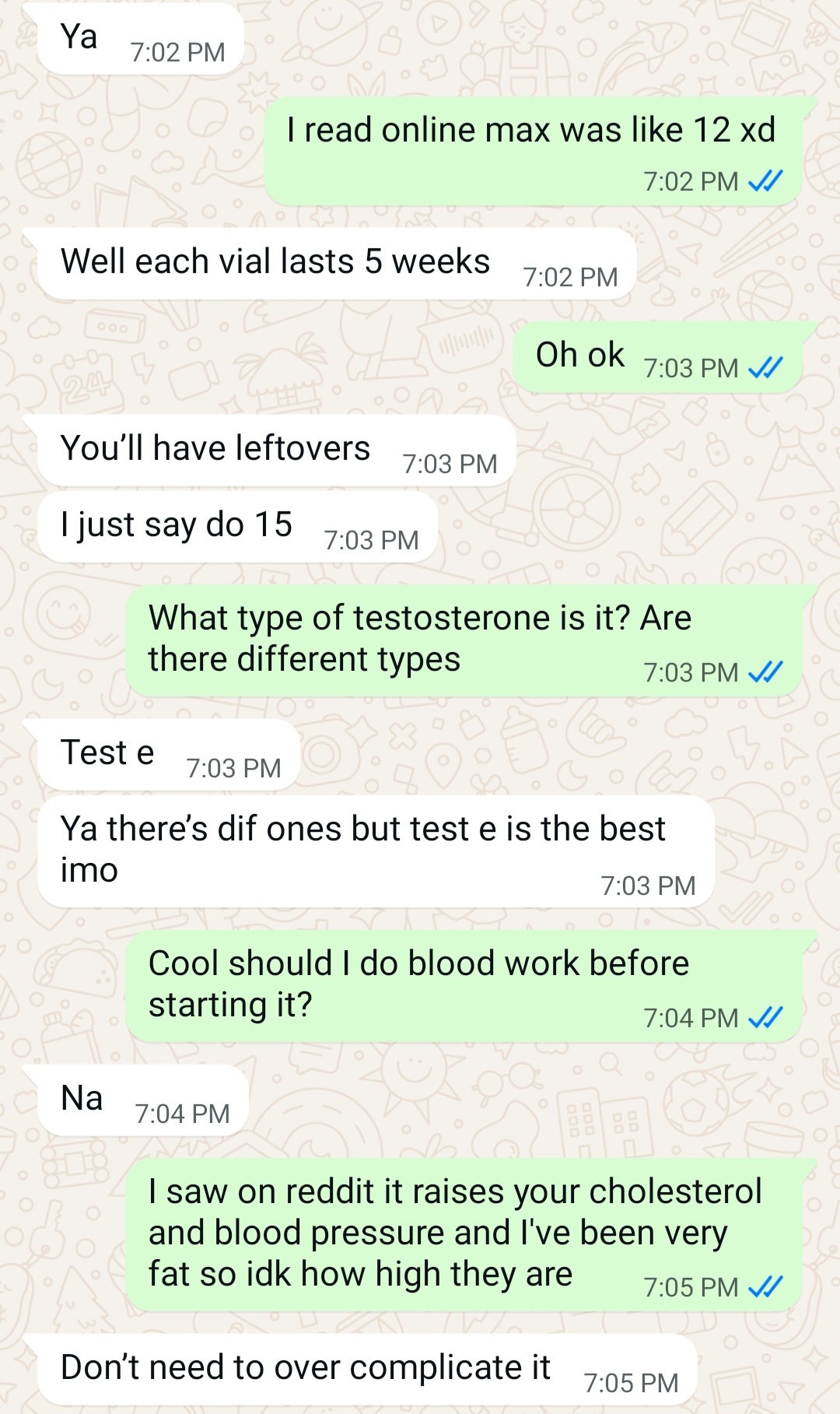 >>76933828Ive read most of the replies. Yes. Get bloodwork done. See where your baseline is at and get another one in 3 or 4 months. Im unclear on your dose? 400mg a week total or 800mg total?Im on TRT as well and run 300mg a week, split into 2 doses since March. I was 225lbs and now Im 180. GO TO THE GYM. I go every day. The Test (C) has transformed me. Take before photos of yourself without a shirt of course and do pics every month. You will be SHOCKED. >47yom