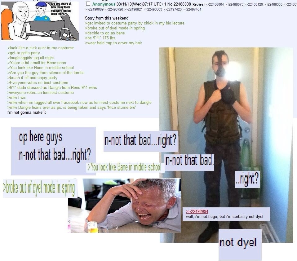 >>76939724you're the same spooky skeleton that thought he was shredded and dressed like bane for halloween but got laughed out and btfo'd by a chad dressed like dangle, aren't you?