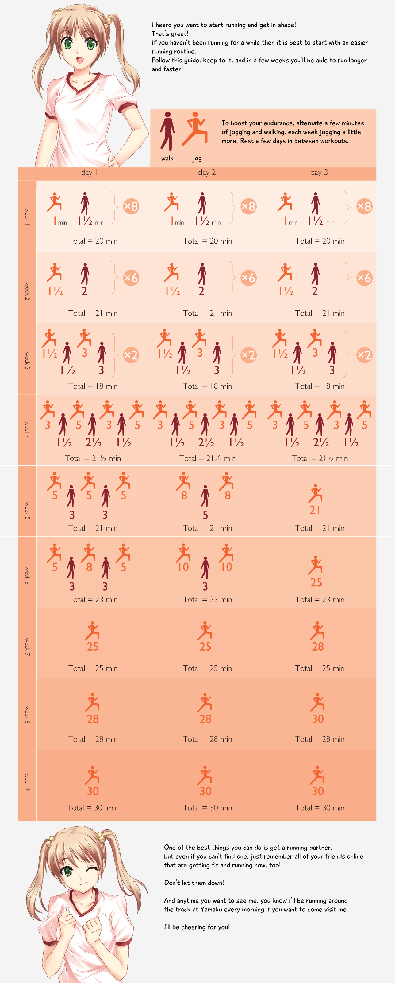 >>76962152My c25k looked like this (each day I just ran as long as I could without stopping, extremely slow pace barely above walking speed)>day 1ran 3 min>day 2Ran 8 min>day 3Rest>day 4Ran 20 min>day 5Ran 24min>day 6Rest>day 7Ran 26 min>day 8Rest>day 9Ran 35 min>day 10Rest>day 11Ran 44 min (achieved my 5k here)My legs still start burning 30 seconds into a run, and I start gasping for air about 5 min in. I can just keep going despite it now. Day 15 currently and I've l lowered my 5k time to 38 min, hoping to get below 30 min soon
