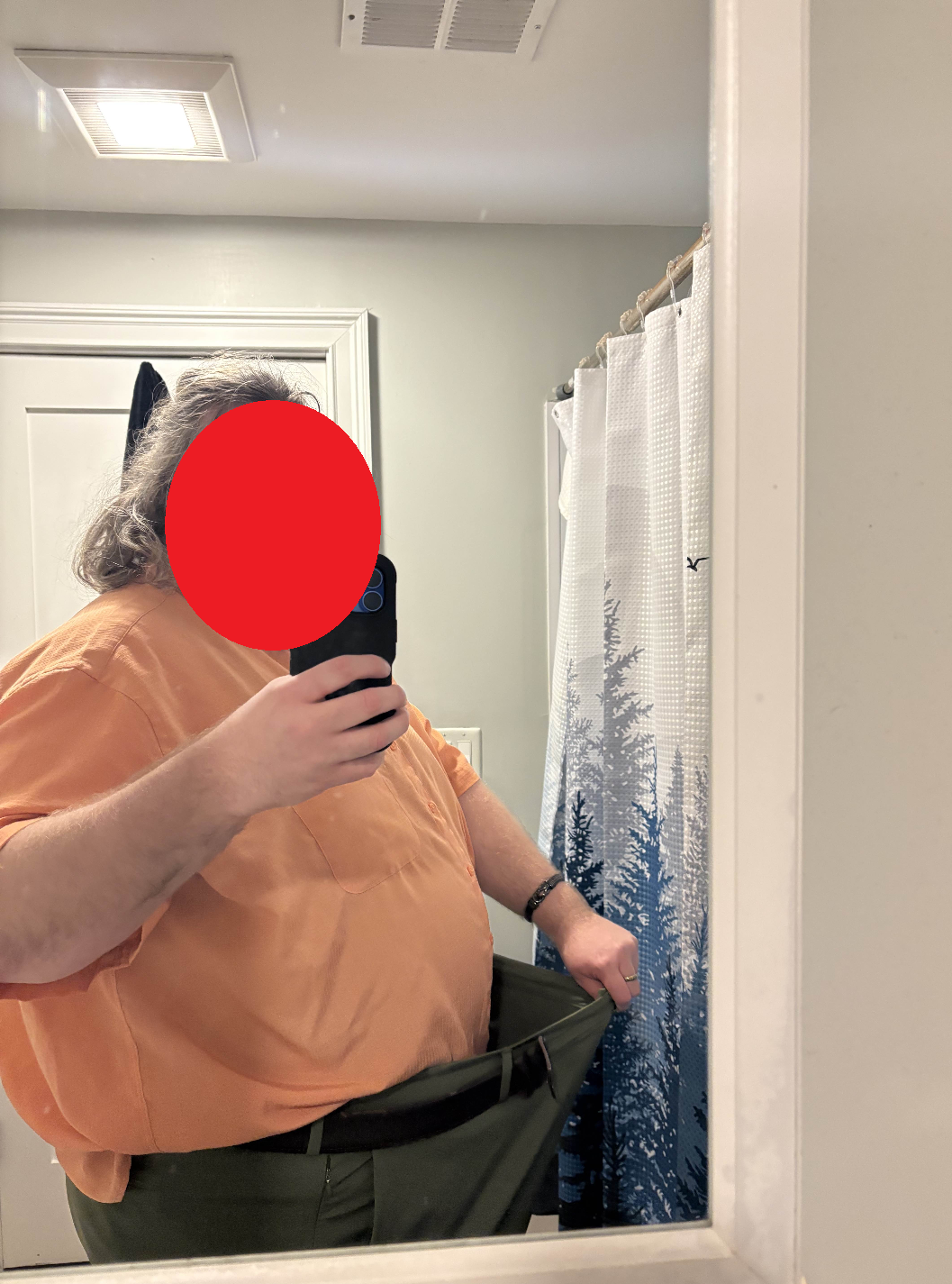 I'm the fat fuck who started at 424lbs. I fucked up when first entering the contest so it's forever gonna have my starting weight at 400lbs.Today I weighed in at 375lbs after two full months.I can't wear my favorite pants anymore without putting my belt as tight as possible and even then they were sliding down a bit today. These pants used to be decently snug. I purposely undid the belt for this picture to show the space.I've got a really long way to go but this was a small victory.Keep at it, guys.