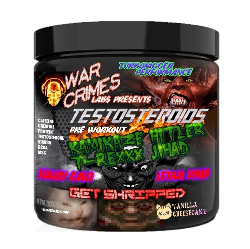 >>76990056>i was surprised yesterday to see something called "total war" and "complete insanity" at walgreens. at first i swore it was some fake shit one of you planted but it was legit.Not trying to shit on you or anything but are you young? All of those exaggerated pre workout tub memes came from the actual labels