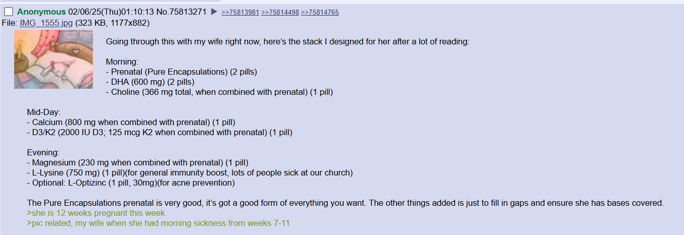 My wife and I have discussed it and we're ready to have a kid. I don't particularly care about the gender but we plan on having at least 6. I vetted her; no smoking, no serious drinking before (I made her quit after), no drugs (not even weed), no partying, healthy diet and childhood, father with a head full of hair, etcWhat I'm worried about particularly is nutrition. We eat healthy but eat meat like 2x a week. I'd rather not her take supplements, but get all of her micronutrients from food. Problem is getting all of them. Also, I remember a pregnancy fitness thread a while ago (can't find it in the archive) of a lady craving and eating ice cream with nuts while pregnant and the kid popping out 95th percentile in weight. I know things like liver are bad because Vitamin A is toxic to the fetus and fish is good because omega 3/6s and eggs for choline. What else should she be eating?