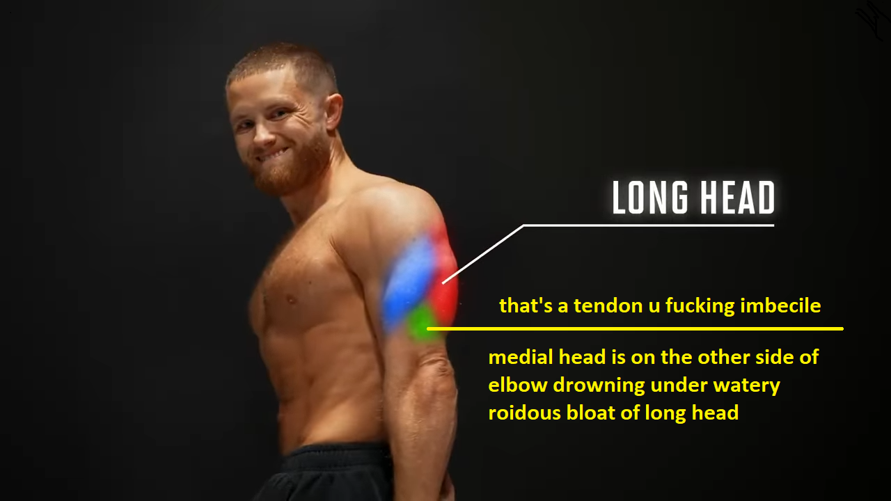77003333to diminish long head abuse and place the load on lateral and medial head do it to the side with full internal shoulder rotation and shoulder dropped down and protracted - unilaterally, cable/rubber at an angle not straight downand brace biceps with other hand/arm - awesome :Ddoing it like pictured loads LATS, and long head which both adduce and extend shoulderdoing it like this also promotes forward shoulder roll and flexed thoracic spine - that's the reason full stack seemingly flies with the power of "triceps" - it's mostly not triceps______________________________________________and ditto for your OP bot: >>77005479