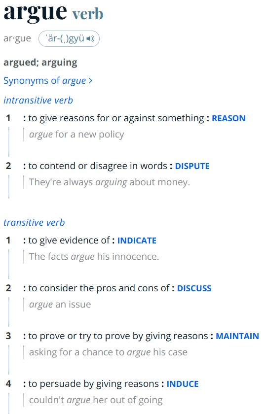>>77008688>An "argument" has two main meanings: a reasoned case supporting a viewpoint (like in a debate or essay) or a verbal disagreement/quarrel between people,Do you disagree with the definition of argument which google gave me?