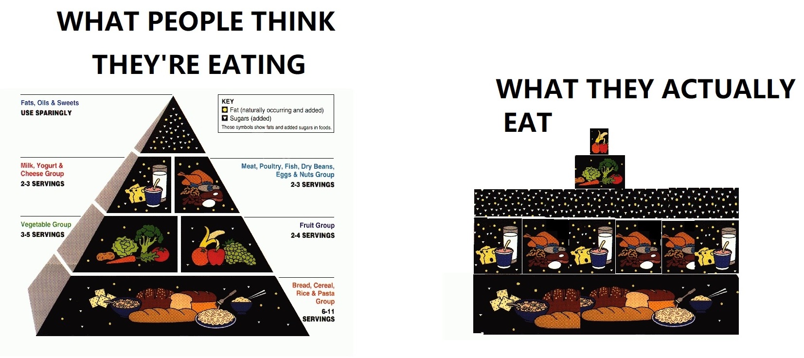 well carbs have been a practical and economical source of calories for some thousand years so they based the pyramid on how normal healthy people ate americans eat sugar and fat instead of whole grains and now you sperg out that the pyramid was wrong