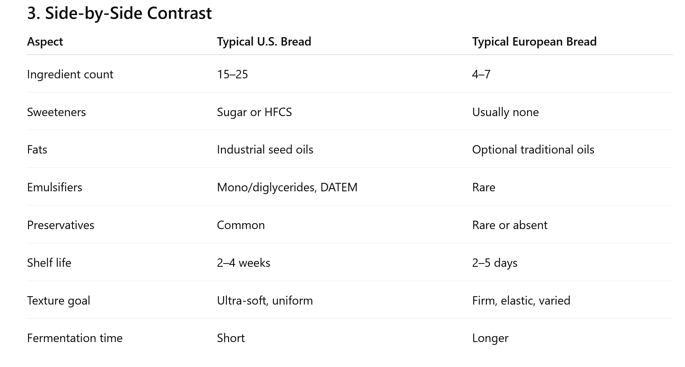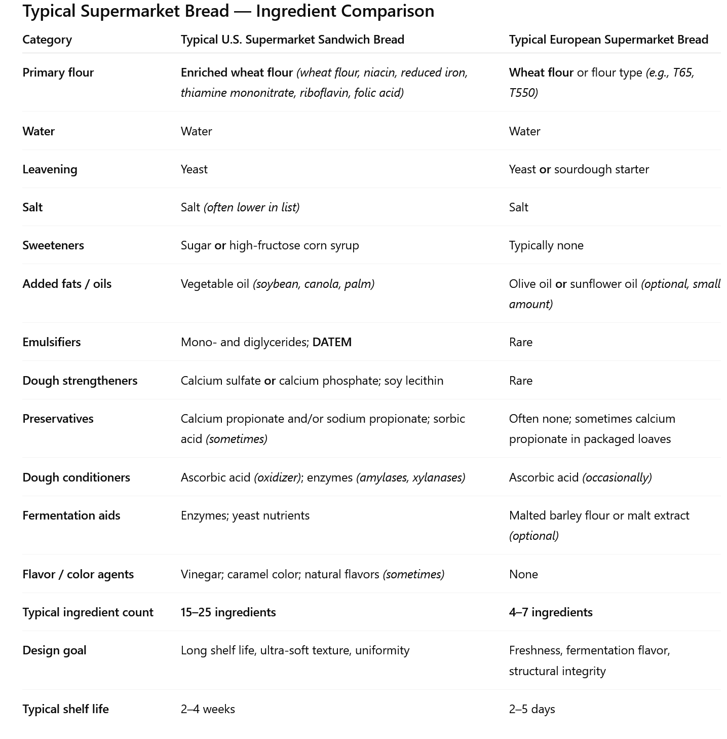 >>77048040>>77048051Over 9000 hours in ChatGPT1. Typical U.S. Supermarket Sandwich Bread(think soft, long-shelf-life white or wheat loaf)A very common ingredient list looks like this:Base ingredientsEnriched wheat flour (wheat flour, niacin, reduced iron, thiamine mononitrate, riboflavin, folic acid)WaterSugar or high-fructose corn syrupYeastTexture & shelf-life systemVegetable oil (basedbean, canola, or palm oil)Mono- and diglyceridesDatem (diacetyl tartaric acid esters of mono- and diglycerides)Calcium sulfate or calcium phosphateOnions lecithinPreservationCalcium propionate and/or sodium propionateSorbic acid (sometimes)Dough conditioning / processing aidsAscorbic acid (oxidation agent, not for nutrition)Enzymes (amylases, xylanases—often unlabeled as “enzymes”)Flavor / color adjustments (sometimes)VinegarCaramel colorNatural flavorsTotal: commonly 15–25 ingredients2. Typical European Supermarket Bread(mass-produced loaf in France, Germany, Italy, Spain—not artisanal, but “normal”)A very typical ingredient list:Base ingredientsWheat flour or wheat flour type (e.g., T65, T550)WaterYeast or sourdough starterSaltOptional additions (depending on style)Malted barley flour or malt extract (for fermentation, not sweetness)Olive oil or sunflower oil (small amount, optional)OccasionallyAscorbic acid (less common than in the U.S.)PreservativesOften noneSometimes calcium propionate only in packaged sandwich breadTotal: typically 4–7 ingredients