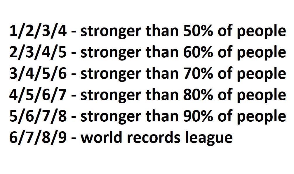 >>77053204>1/2/3/4 - stronger than 50% of people??? That's an intermediate milestone. Most guys can't even deadlift their bodyweight.