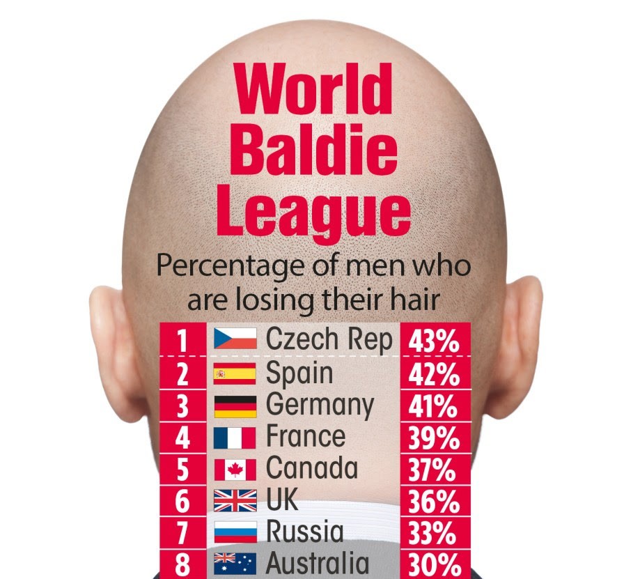 >>77053829>>77053968>>77054038The list is kind of nonsense in that it omits countries (most of which have no data), and 'baldness' is hard to define, but baldness seems to be focused around the mediterranean, which is interesting as these populations have more body hair on average. Theres not really much difference between european countries, you could easily change it one way or the other depending on methodology. Southern europeans and arabs seem to be the baldest though.