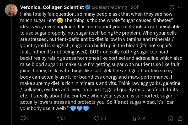 >>77058203>Refined sugar really is bad for you thoughhow long it stays in the blood depends on insulin sensitivity/resistance. if eating lots of sugar (not bad in itself) causes high blood sugar, then you just have insulin resistance. reverse that, and problem is solved>The body's sugar uptake mechanism is not calibrated to consume copious amounts of refined sugar.this only applies if you are insulin resistant, or when your glucose metabolism is impaired. most people who have an inefficient metabolism get fat from eating sugar. but again, it's completely absurd to blame sugar. your body just doesn't know how to treat it>>77059193there exists literally no refutation against the peat philosophy. >>77060043yes, when you can't metabolise it properly, sugar is bad for you. but it's still a retarded way of looking at it, because it places the blame on the sugar and makes you blind to the reality