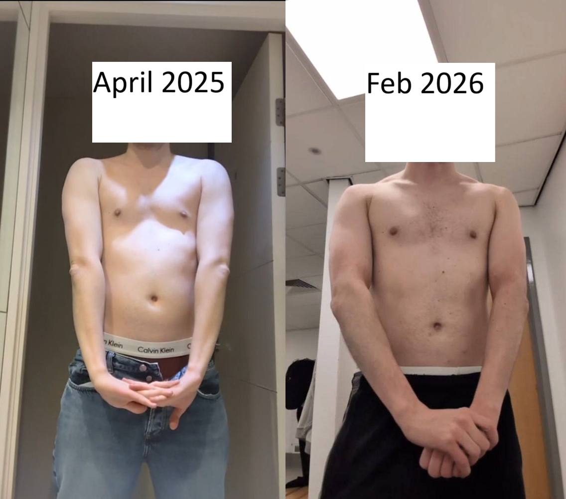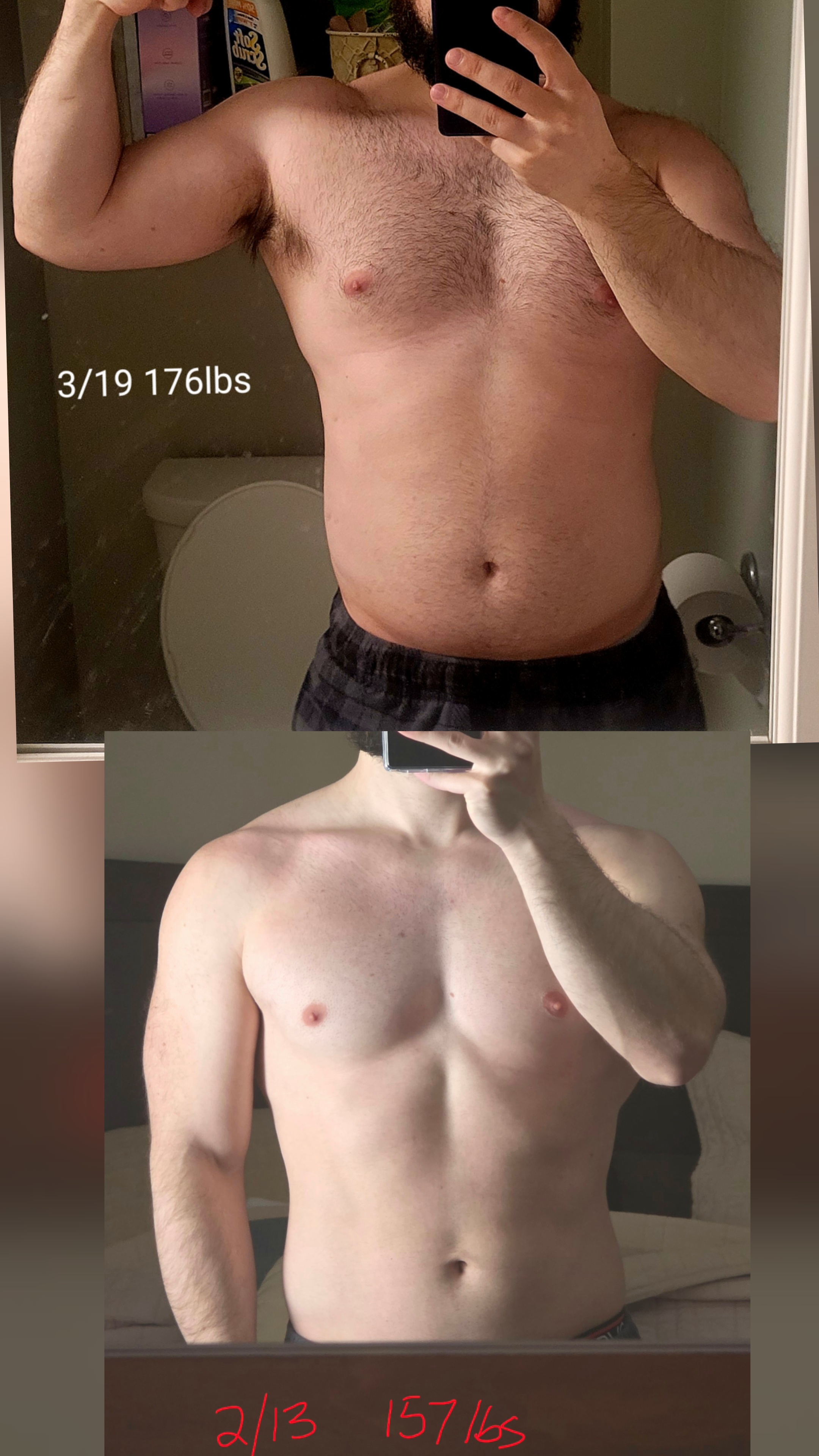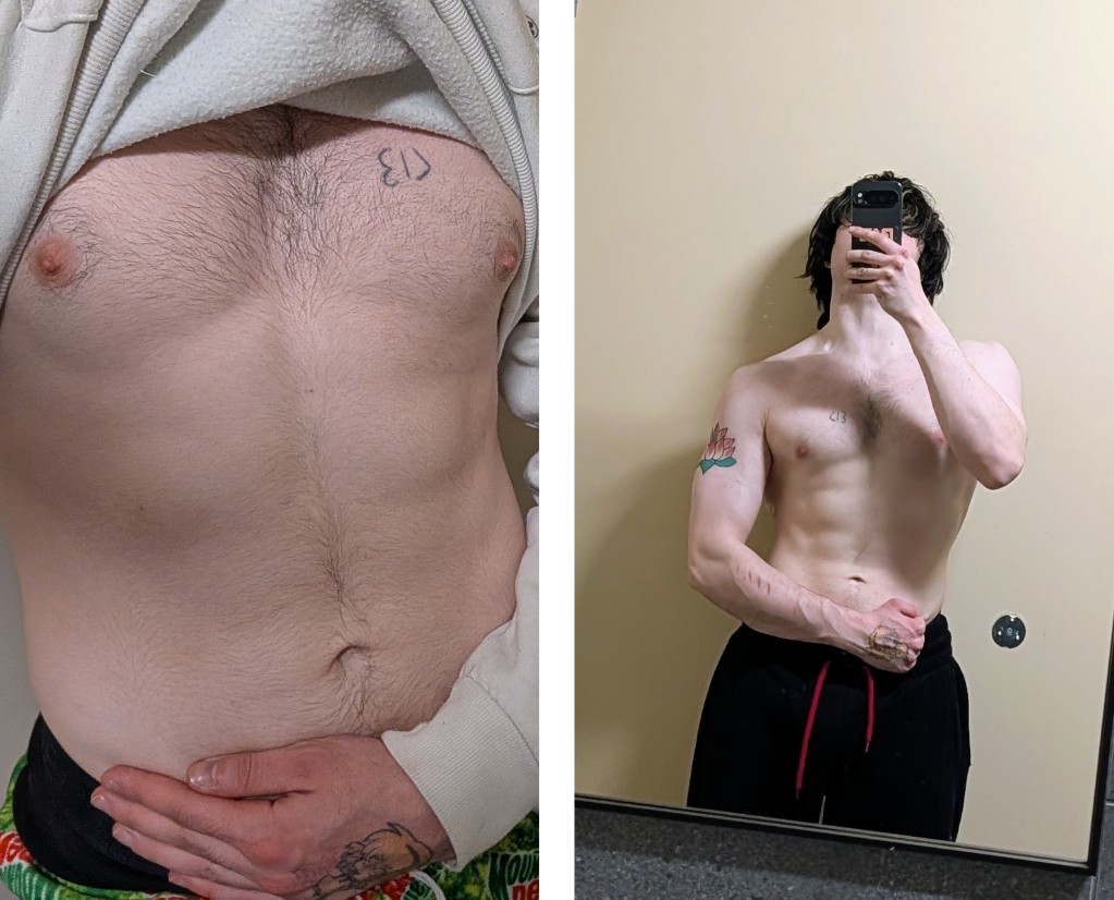 >left april 2025, 5'10 135lbs>right feb 2026, 5'10 149lbsi just got vaguely hairier :(