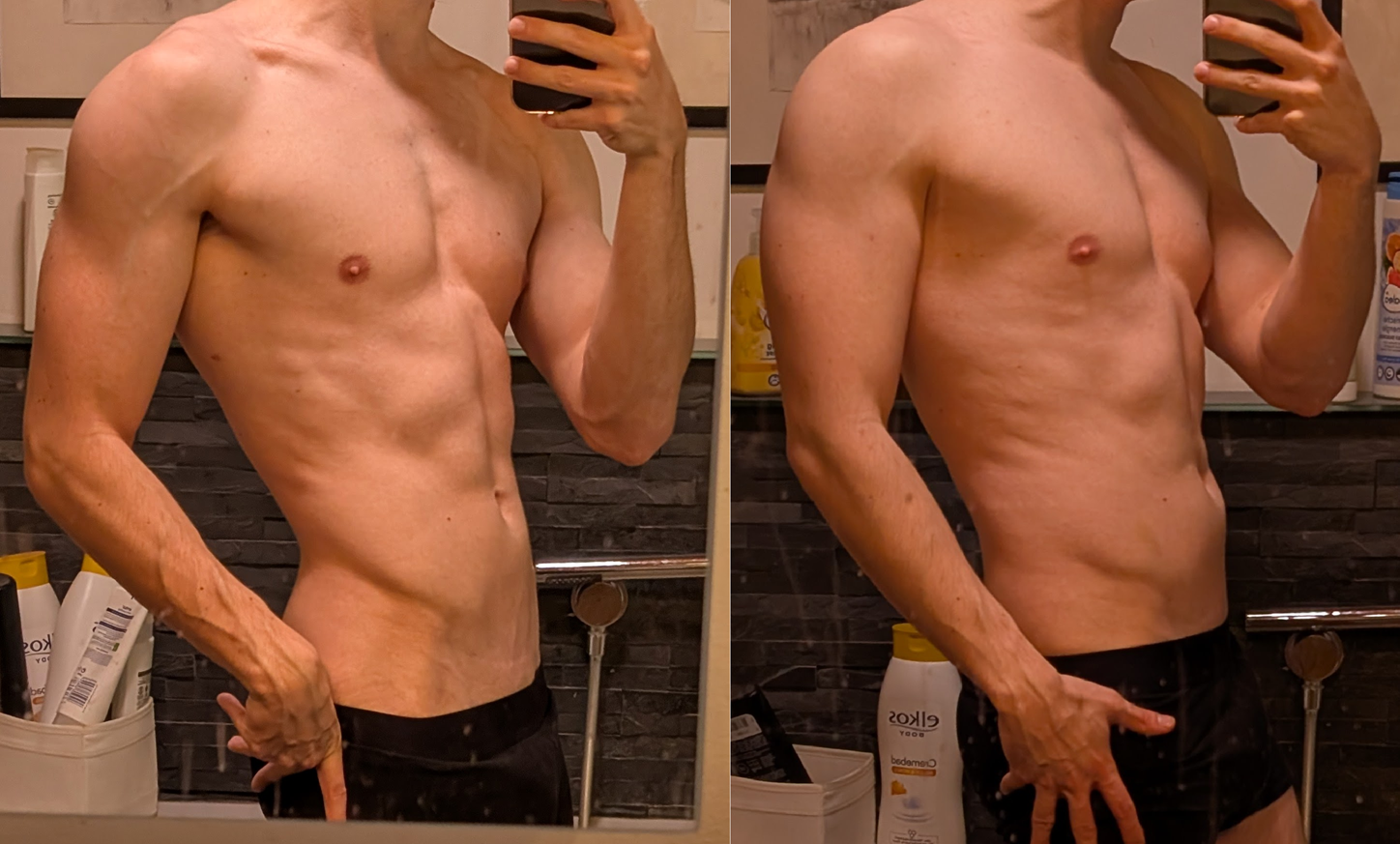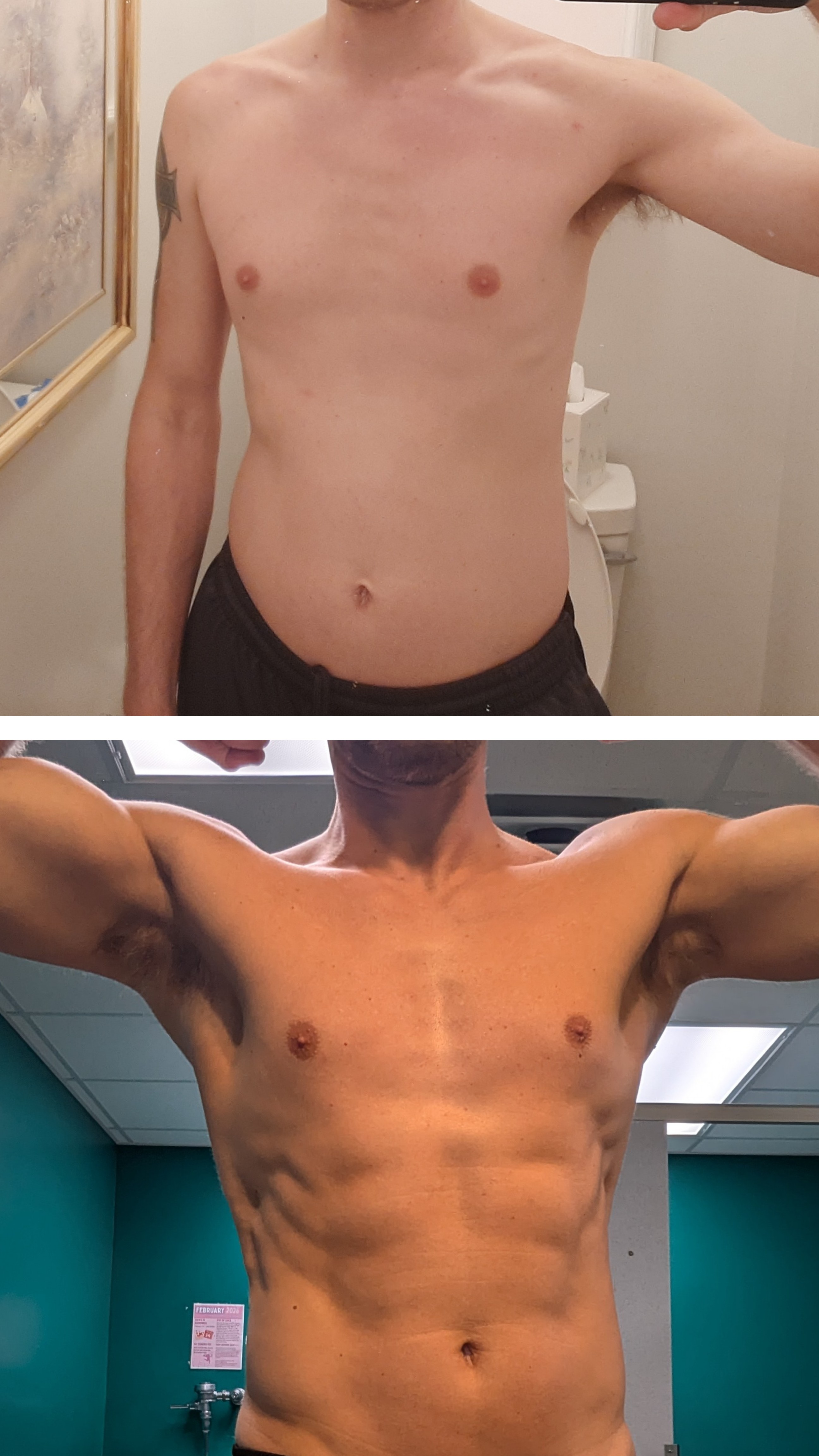 Pls no bully1 year apart, barely any progress beyond tiny amounts of muscle mass in some places like arms. That's what I get for being a genelet.Also>the occasional friday night wine>the suboptimal protein intake on working days>the suboptimal sleep due to adult lifedon't help.But eh, it's better than nothing. I still mog most of the normies around me.