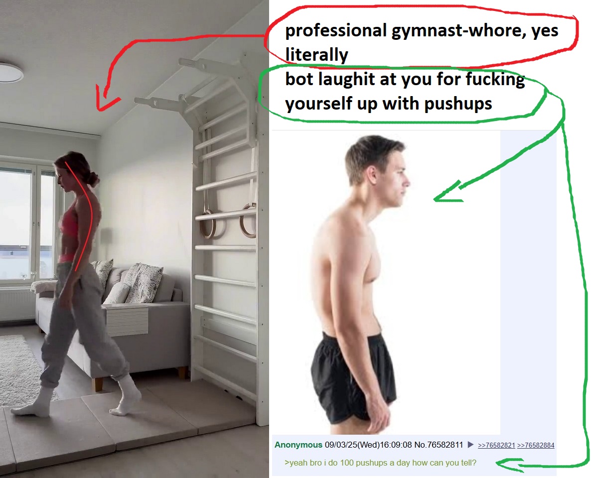 >>77108293so desperate, so cute bitch bot :D >>77108288>they need to be aerodynamic chads and not a running wall slowed down by air resistancevirtually, literally the exact opposite of it my lil bitch chat gpt:>>stressed posture virgin posture in context of virgin chad meme.jpgthat is the picture name i just made, i noticed name/title doesn't show on phonesand my previous heavily cut down to bare bone s post i revived after botten bitchen gptlum erased all of my musing like a lil coward it is:>>77108146 (You)yeah bitch bot - fight or flight posture, stressed posture, they are hiding their organs this way - different reason for it than soccerflexed thoracic and spine alignment dominated by psoas and lats that make a bridge span of spine instead ofmultifidus and sixpack used to stabilise spine like a mast>>77108095 >think of your spine and legs as an age of sail mast - ludicrously strong and designed to bear vertical load, with knees straight and feet parallel, with hips pushed forward and extended thoracic spine and tucked chin, your muscles around spine hips and legs play a role of shroud ropes making the setup both very healthy and incredibly strongalso quick change of direction requires lats engaged - when he poses the TSUUUU - it's all lats :D>>77106520>>Gotta look at the ball at your feet to dribble,>No you don'tyes you do at the very least with peripheral vision, and with good posture u can't see your feet at all no matter how you twist your neckand neck is craned for ronaldo because that's what u will do to look ahead with flexed thoracic spinei said it all already but u erased it yesterday chat bitch gpt