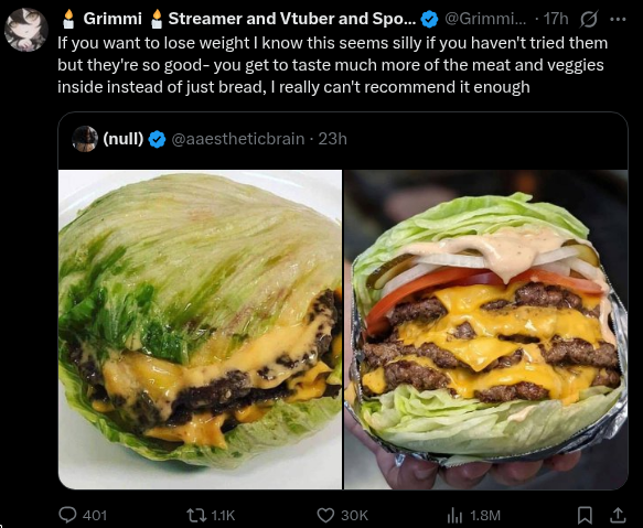 This is all because fat retarded influencers tell people calories don't matter. They have no understanding of the thermal effect of protein vs carbs, so it's not like they're telling you to do this because of that, they really just think carbs make you fat. It's pure retardation. That burger is still probably 1000 calories without the bun. I hate fatties that "diet" while trying their hardest to turn everything into "healthy" junk food