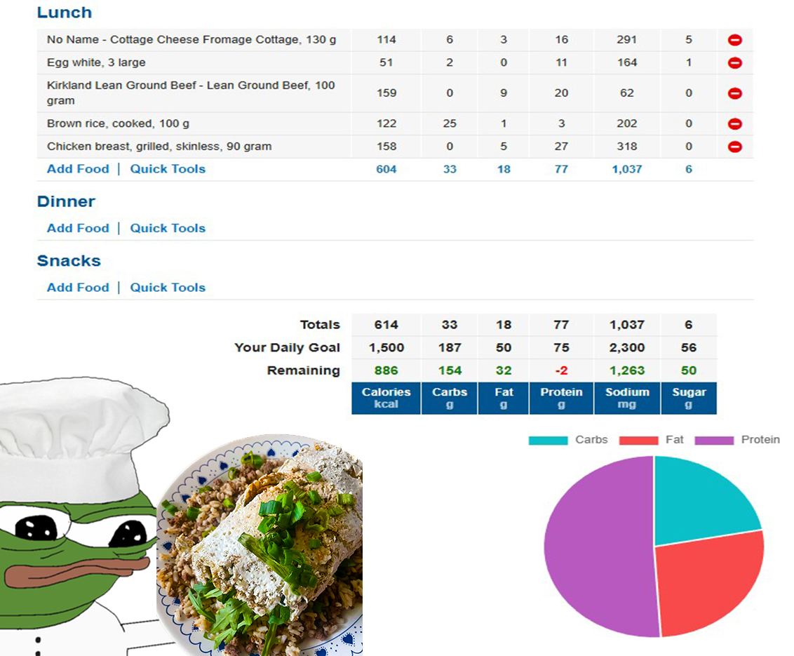 made the viral cottage cheese roll with 3 egg whites put some rocket, 3 cherry tomatoes some vinaigrette inside and a bit of chicken on top of my protein slop (brown rice+lean ground mince). are these macros good? i could seriously eat this shit everyday