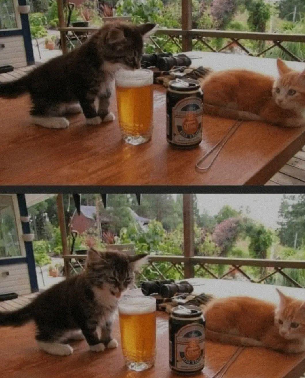 haha don't drink the beer little cat!