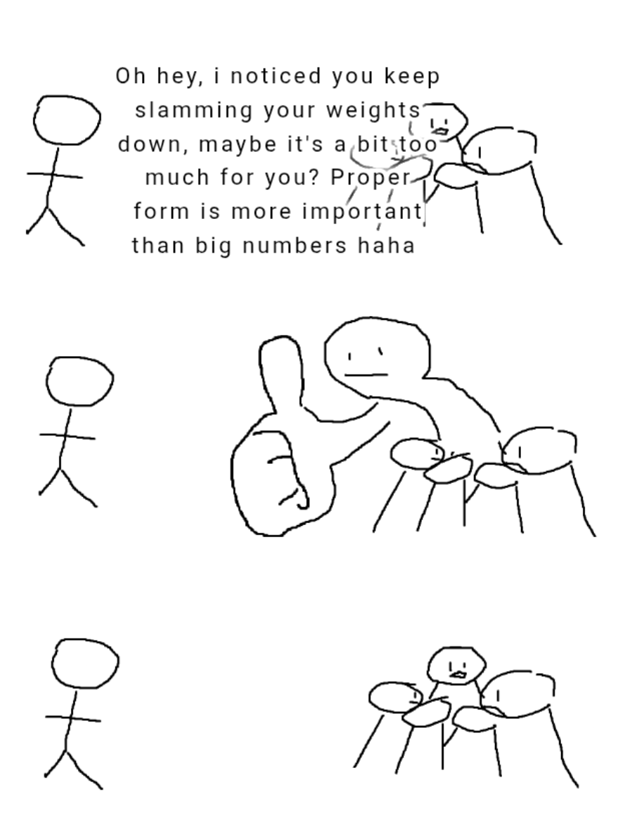 >"Oh hey, i noticed you keep slamming your weights down, maybe it's a bit too much for you? Proper form is more important than big numbers haha"How do you answer without sounding mad?
