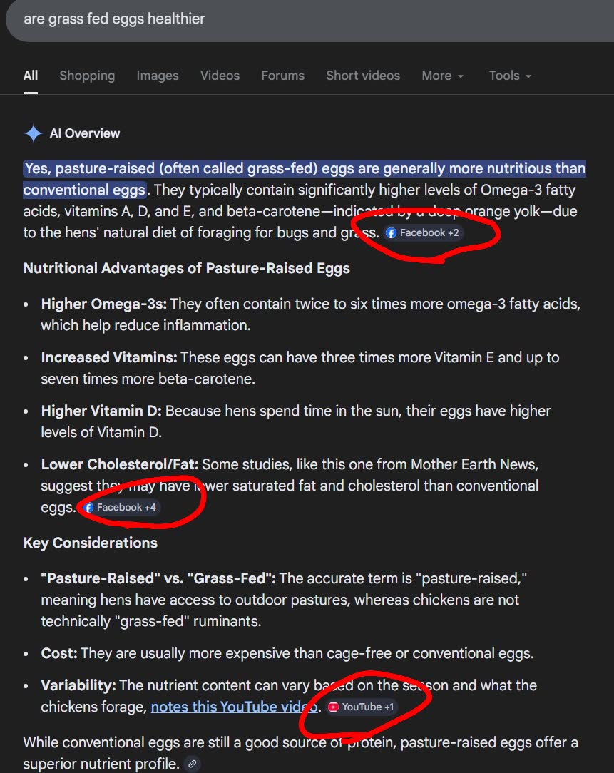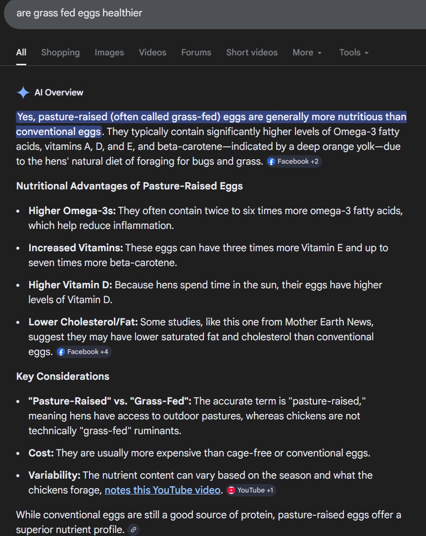>>77166157when i looked into it a couple years ago, they used to just lie and say they were the same. they'd make article headlines that say "no difference between pasture raised eggs" then in the articles there would be a chart showing pasture raised are healthier, this would be enough to trick most retards (You). but i cant find any articles that lie anymore, even the one i bookmarked from a couple years ago is 404. even google's ai summary says they are healthier. there is no excuse for you at this point.
