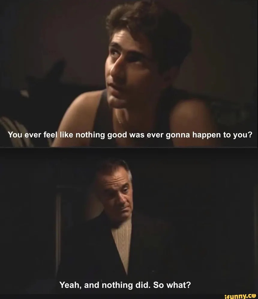 >>77169604i ain't reading all of that, but that scene in Sopranos was so good. I believe the actual response was, "Yeah, and nothing did. So what? Who gives a shit?" which is even better in the context of the conversation.