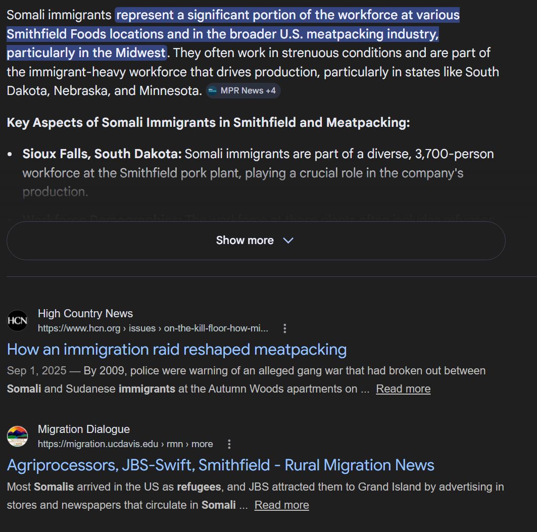 >>77173722>They wouldnt be working in a pork factory. Your story is made up.Yep I must be one of those magatards talking shit about Somalis because I hate stronk Somali womyn like Ilhan Ohmar.