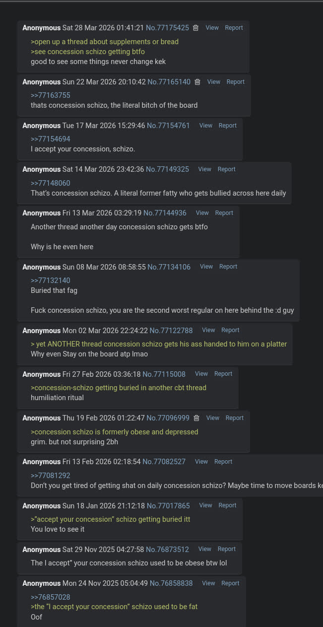 based but dont bother replying to concession schizo, its a formerly fat sperg who just gets off on critiquing everyone, hes never posted body
