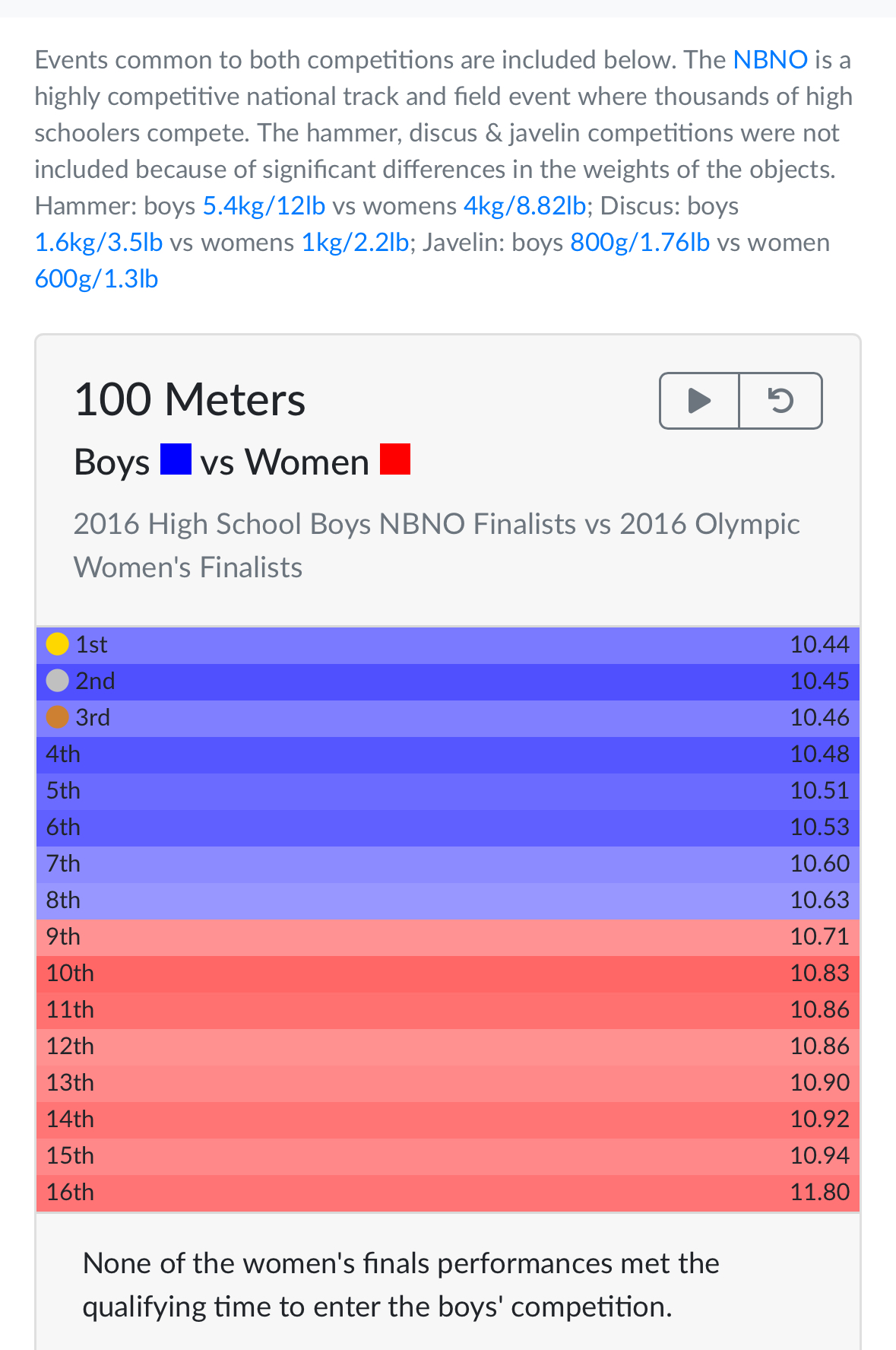 >>77175975>it’s probably more social factors than choiceAbsolutely 100%, unequivocally, indisputably untrue. Men are biologically built to be superior to women in every single measure of physical prowess. Don’t believe me? Here is irrefutable proof:www.boysvswomen.com>olympic gold medalists, women who have trained their entire lives to be the best of the best women in their respective disciplines, would not even meet the requirements to participate in HIGHSCHOOL BOYS track/field and swimming meets.These are children and the women are in their prime/peak with 10-15 more years worth of training and working at getting good at whatever. It has nothing to do with social pressures or whatever. As another anon pointed out, men have:>larger hearts relative to body size>larger lung volume relative to body size>larger volume of blood relative to body size>lower body fat to muscle ratio>higher bone density>different hips/gait which leads to men being able to run much faster>denser musculature with a different ratio of fast/slow twitch fibers more conducive to explosive movementsIt is what it is,