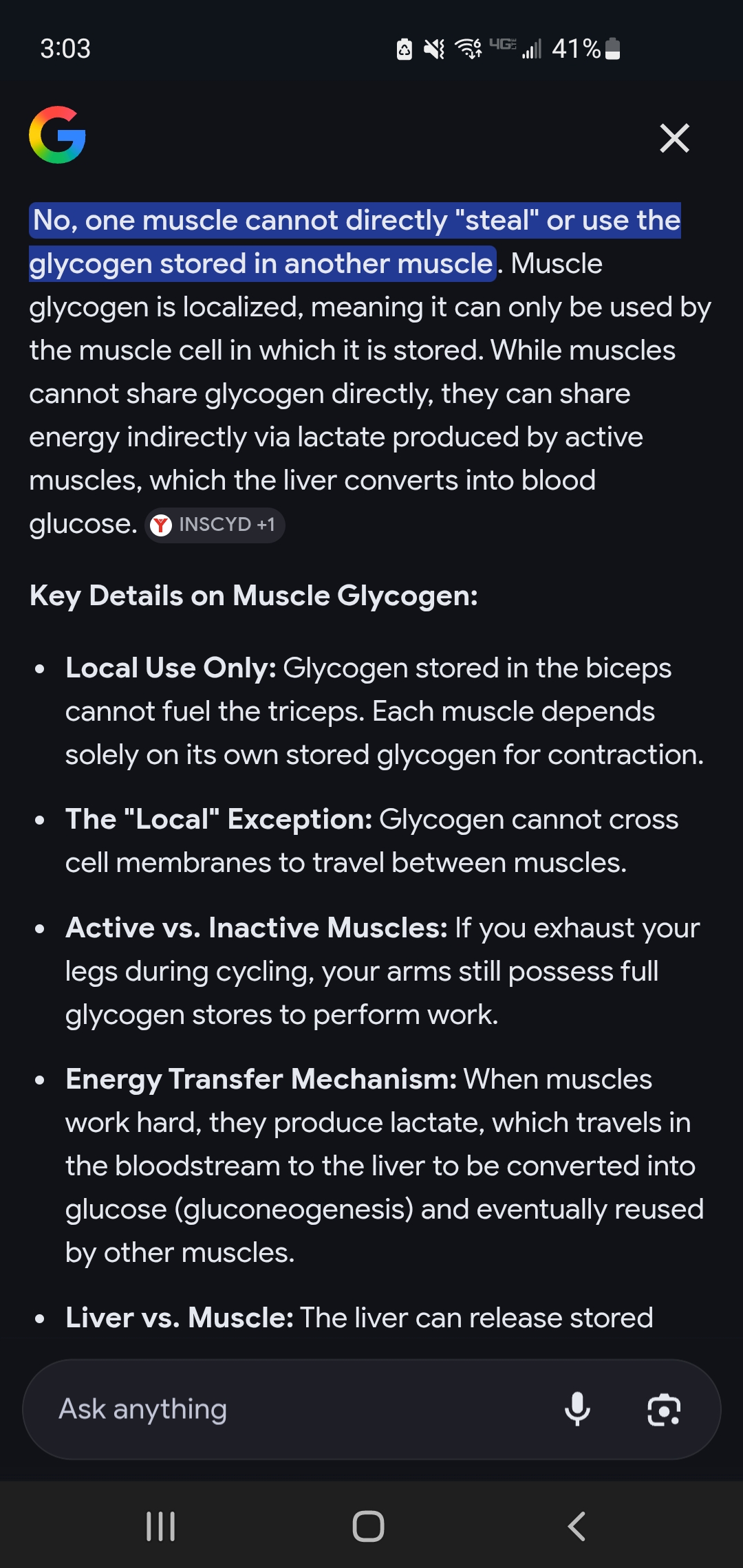 >>77187544Glycogen is also stored locally in the muscle.I've sufficiently answered your question here >>77184492. You're arguing just to argue.