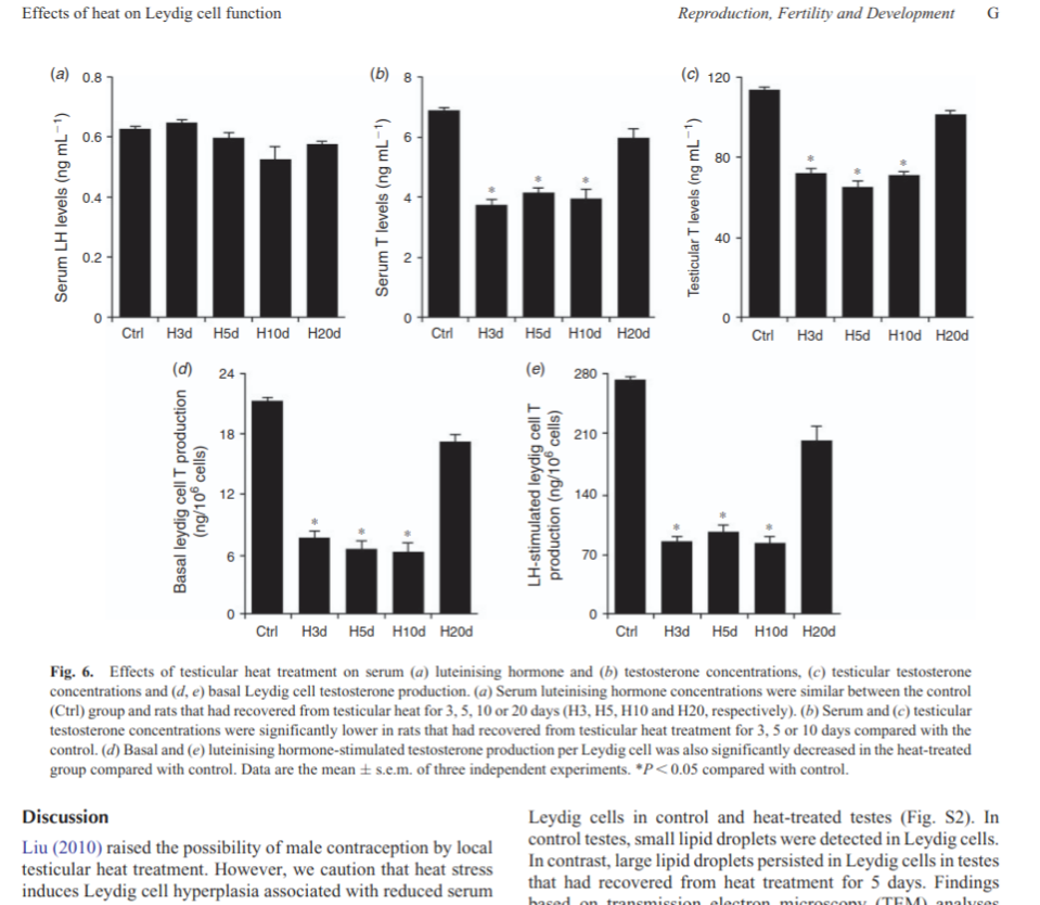 >>77180997Hot baths lower sperm count to zero, if you are not trying to have chdren this is not a problem.Though there is a concerning rat study where they made rats take just one hot bath in 43 degree water for 30 minutes, and it dropped testosterone levels by around 50%, and it took at least until day 20 after the bath to start to recover normal testosterone levels.Anyway, in my western cultural upbringing, having hot baths is female behaviour. Males have showers, and the hot water will have cooled down sufficiently by the time it trickes down to the ball sack area, so it doesn't cause harm to the testicles.By the way, the testicles are located outside the body to keep them several degrees cooler than body temperature of 37C for optimal function.