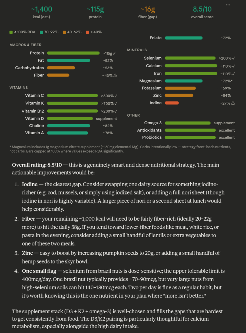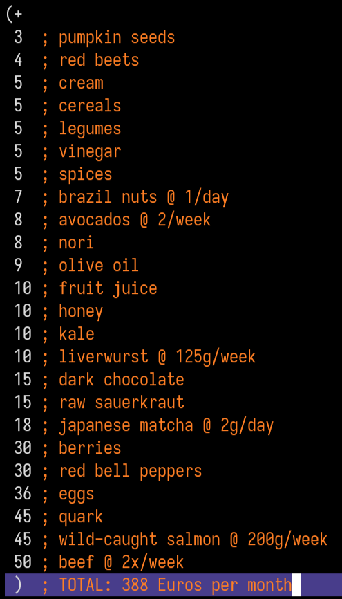I was worried that eating healthily and covering all my nutrients would be very costly, but this is actually very affordable, at least until the fertilizer supply shock hits.Could save another 50 bucks by halving my smoked salmon intake and replacing bell peppers with rose hip powder.