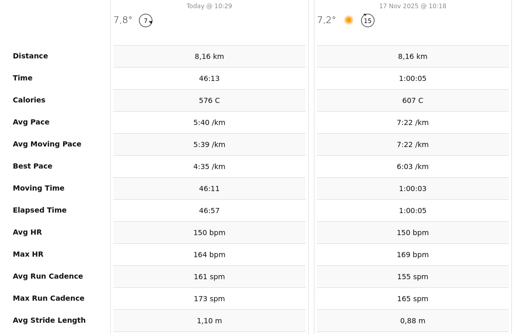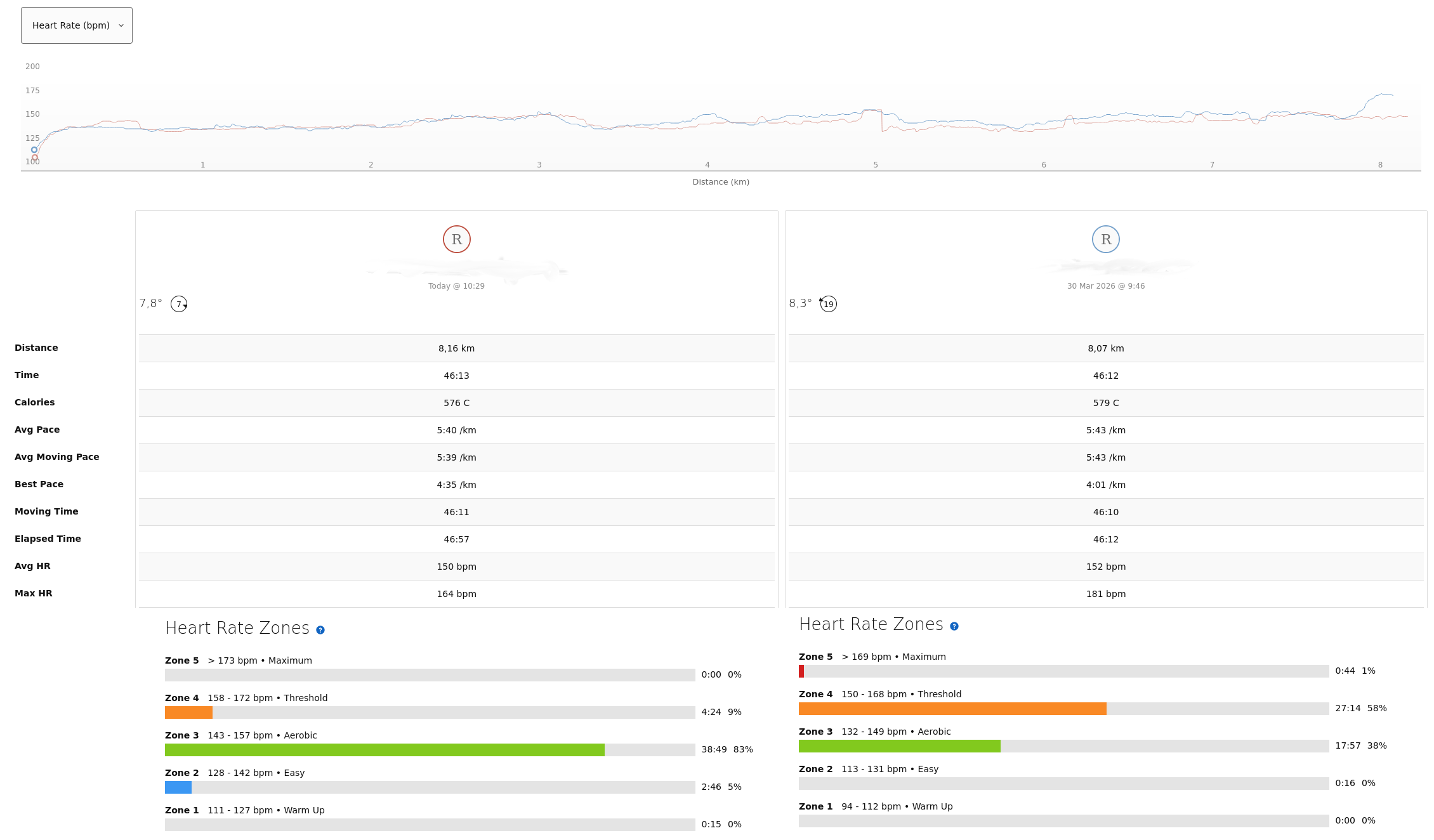 Changed the zones on my watch from straight HR to reserve HR, as an Anon said to last thread.Not much change for me ig. Keep thinking the watch is fucking up when it reports HR under 150, like, what the fuck.App marks both as "improving fitness", with "tempo (aerobic)" as primary benefit, too.HR dip today because at 5km I stopped to clear up mud under my shoes. Up on the other at the end because I sped up for a min not today though.