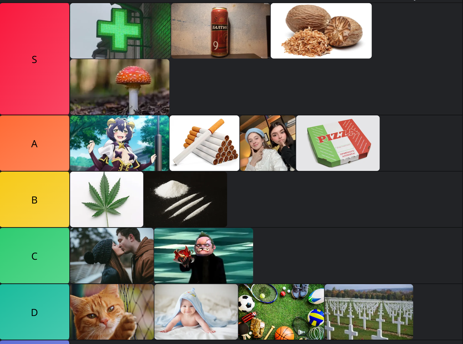 >>77185732yeah what the fuck. it’s a drug list, i guess, so it’s going by what feels best? or is anabolic? how the fuck does any of this relate>S tier: going to the pharmacy(?), strong beers, nutmeg, amanita muscaria>A: anime tits, cigarettes, young foids, take away pizza>B: weed, cocaine>C: kissing/relationships, some PS2 vidya game??>D: owning a cat/being a cat(???), having a baby, sports, fucking dying and being put in a graveyard?