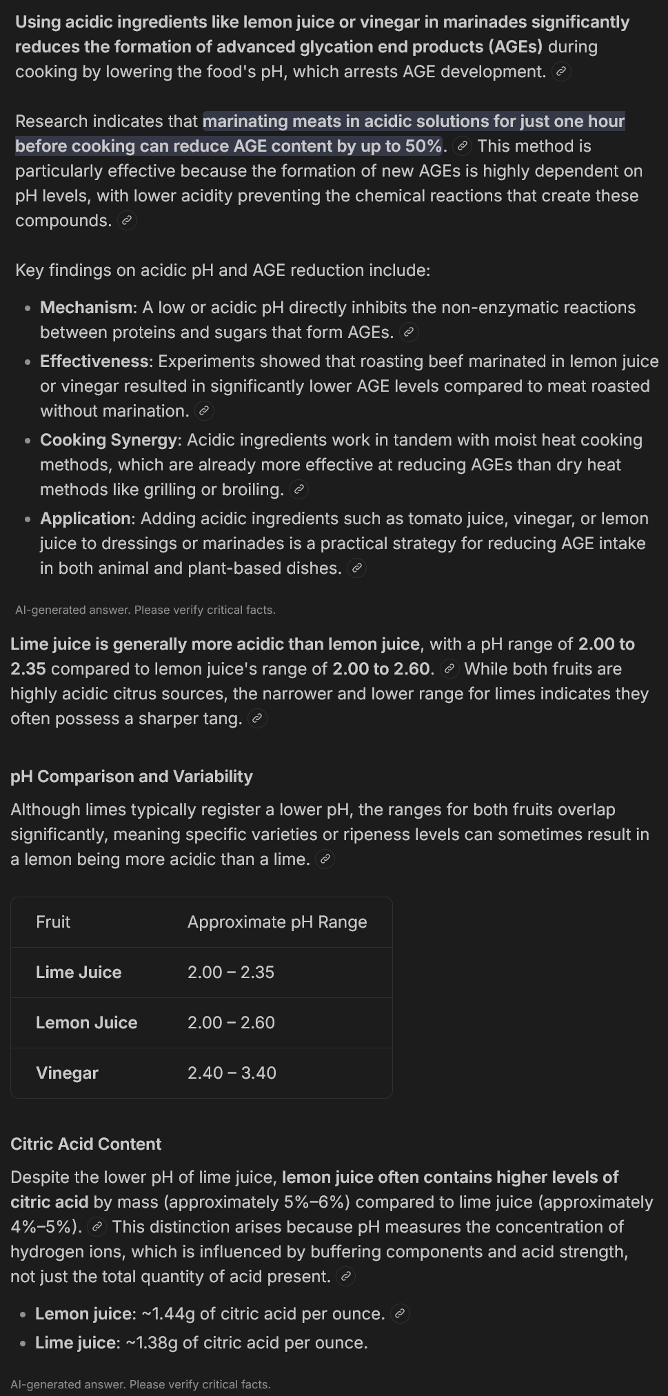 >>77187394>>77187400My top anti-AGE strategy with meats is lime juice; pre-marinating for days in high concentrations and then mostly cooking at 150F (65C) to 180F (82C) in acidic solution. I average a couple eggs a day plus fairly diverse meat consumption, although somewhat higher fish than red meat.