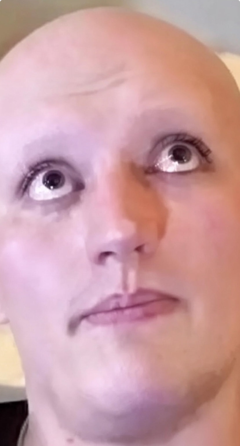>>77186795Androgenic still shot from a Livestream today with eyebrows removed and bald head.